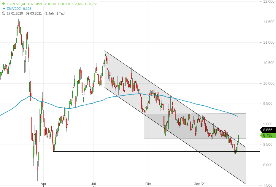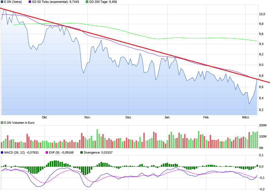 Kurzfristig ist e.on nun oben an einen parallelen Abwärtstrend gelaufen, der seit 3 Monaten besteht. Meiner Meinung nach müsste der Kurs mindestens über 8,85 springen, damit ein erster Boden gebildet wird. Die Frage ist halt - und das wird hier ja auch schon von einigen hinterfragt - wer kauft denn jetzt e.on? Oder schwimmt die Aktie nur mit RWE mit oder korreliert nicht mit dem Dax wie schon seit Wochen. Professsionelle Dividendersammler werden in den kommenden Wochen vor der HV auch verstärkt auftreten.