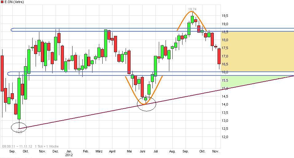 wie zu sehen auf dem Chart von Crunch, hat e.on ein neues Hoch gemacht (Sept 19,74). Ich hatte tatsächlich angenommen (gehofft), dass es in einem steigendem Gesamtmarkt noch weiter bis über 21 läuft. Leider sind die Märkte in eine kollektive Abwärtsbewegung eingetreten. Für diese "Annahme" durfte ich mich dann wenig später entschuldigen. Wir wissen, e.on muss sich wie alle anderen an die veränderten Bedingungen (Stagnation/Rezession) anpassen. Erste Schritte sind gemacht, wird sich zeigen ob das reicht. Zurück zum Chart: Ob wir die 16 noch sehen kann keiner sagen, man kann abwarten und die 16 kaufen oder was anderes machen wenn nicht. Ich selbst bin mit kleinem Verlust dabei - einfach zu ungeduldig, der alte Fehler! Worum es mir geht: das Hoch bei 19,74 sehen wir nochmal wieder, sofern die aufsteigende Keilformation intakt bleibt - timing ist hier gefragt, damit man in den länglichen Seitwärtsphasen den Einstieg nicht verpasst, nur meine Meinung.