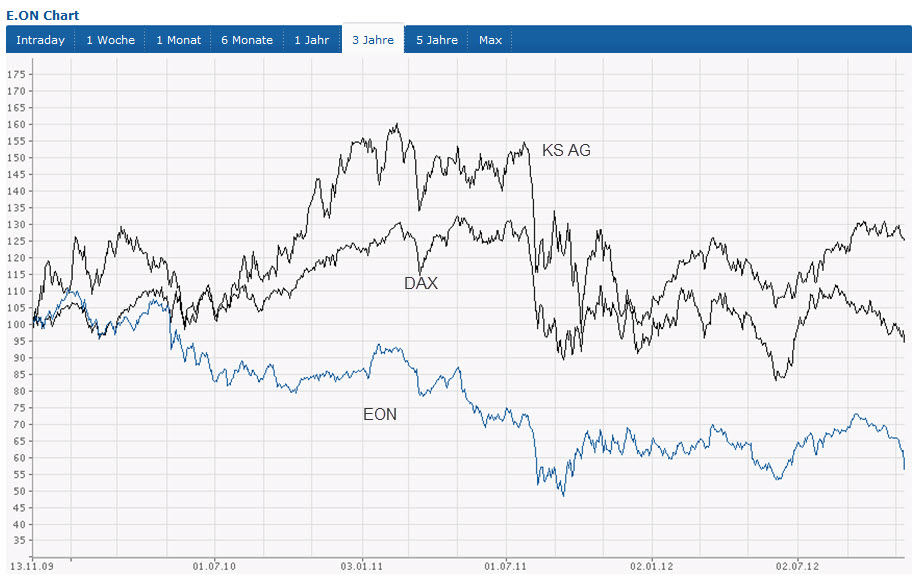 wo eon (und andere, vergessen wir RWE nicht), kursmäßig herkommen, wer bei eon so bei 40,00 bis 45,00 eingestiegen ist, muß noch eine Weile Dividende kassieren um wieder in die schwarzen Zahlen zu kommen. Und über einen zwischenzeitlichen Tagesverlust von 2,00 € kann so jemand dann auch nur relativ müde lächeln ...