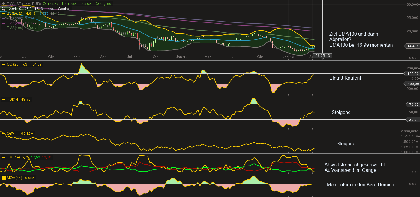 Auf Weekly gesehen zeigt das CCI Signal eindeutig Kauf, RSI ist steigend...OBV steigend....und DMI Signal deutet die Abschwächung des Abwärtsganges und auf einen Aufwärtsgang hin....Auch das Momentum taucht langsam in den Kauf Bereich ein....