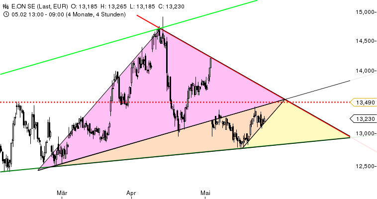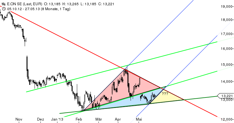 viel dafür, dass e-on nach oben ausbrechen wird. Und die letzten Wochen und Monate haben gezeigt, dass wenn es mal nach oben ging, das oft sehr schnell ging. Ich kann mir gut vorstellen, dass die Aktie vor dem grossen Verfallstag Terminbörse im Juni stärker nach oben tendieren wird.