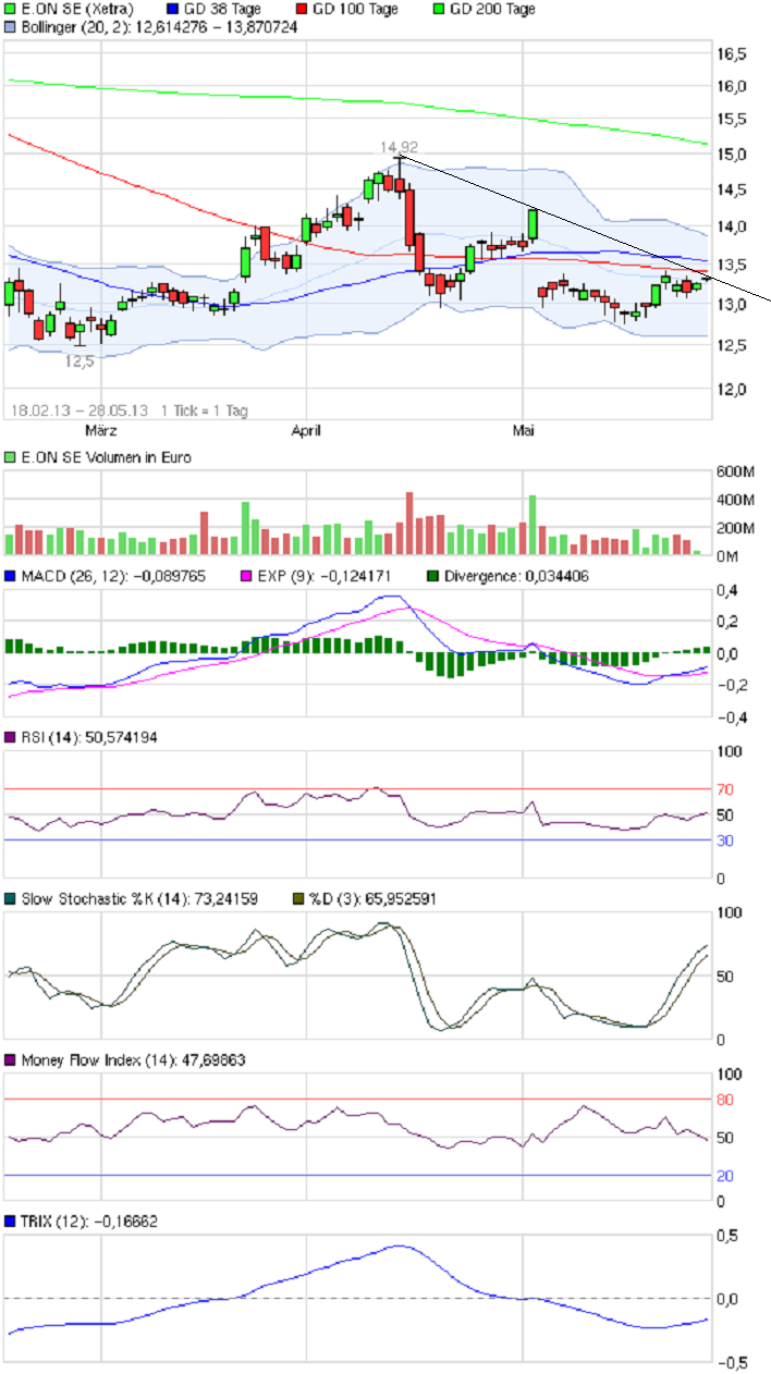 ich denke 13,34 wird nur EoD eine Bedeutung haben. Das nächste Ziel wäre danach (auch Intraday) erst ein mal der Zwischenhoch bei 13,42. Danach erst ist der Gap bei 13,79 an der Reihe. Da es aber den Anschein hat, dass hier wirklich der Divi-bereinigter Chart gehandelt wird, hat die Gap-Marke wohl auch keine größere Bedeutung. Ich würde nicht ein mal im "normalen" Chart mit einem Abpraller an der Stelle rechnen.
