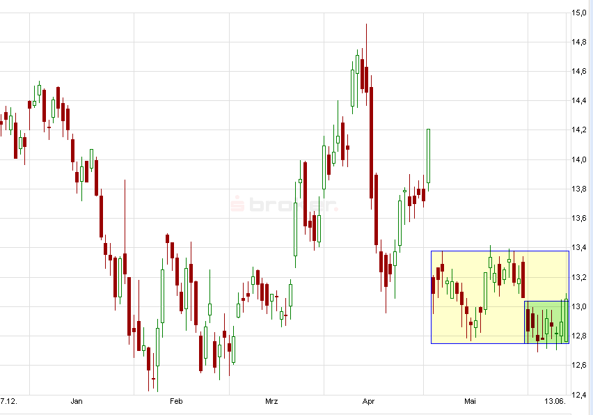 Heute womöglich der Ausbruch per SK (muss man noch abwarten) aus der von dem Außenstab vom 03.06.2013 definierten Seitwärtrange (grün). Falls erfolgreich, anlaufen der oberen Begrenzung der übergeordneten Seitwärtsrange (gelb). Sollte hier nicht zu einem Abbpraller an der oberen Begrenzung sondern zum Durchbruch der 13.42 Marke per Sk kommen, wird es der eigentliche Startschuß sein, denn hier werden mehrere markttechnische Faktoren zusammen kommen.