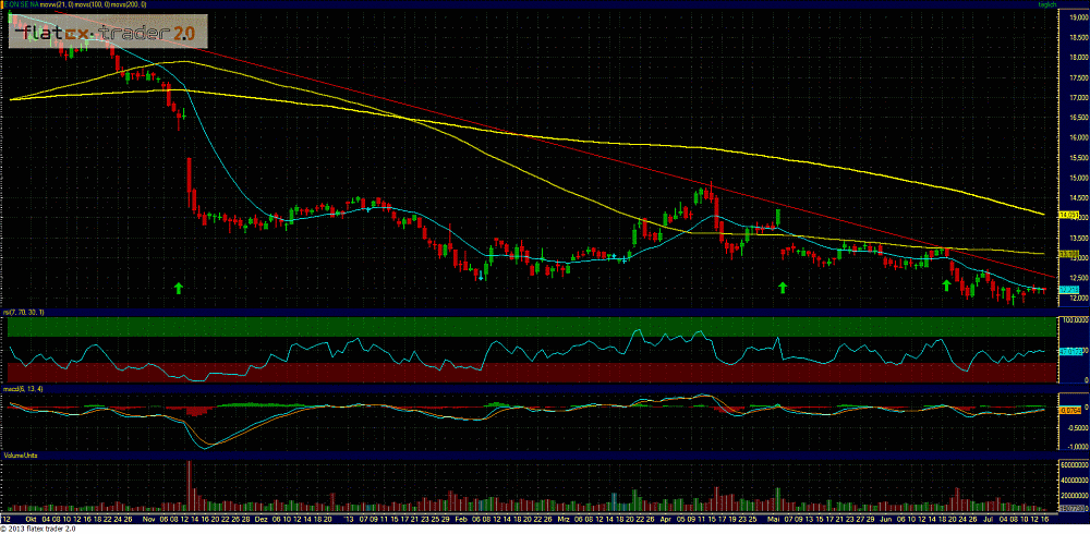 Stabilisierungstendenzen und den Versuch einer Bodenbildung sind aber zu erkennen, allerdings stehen sie noch auf wackligen Beinen und könnten bei schlechten News oder Gesamtmarktumfeld wegbrechen. Aber diese Gefahr gibt es immer und überall. ;) Zumindest wäre fürs erste eine technische Gegenreaktion zum ersten offenen Gap drin, um die Bullen auch mal an den Drücker zu lassen. Ein erster Schritt wäre es, wenn wir endlich mal die 12,30 hinter uns lassen könnten. Nur nicht den Mut verlieren.