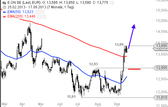 DER AKTIONÄR wird die Reformen einer wahrscheinlichen großen Koalition genau verfolgen. Da die Details über die Neuausrichtung der Energiewende noch immer offen sind, bleibt die Einschätzung zu den Aktien der großen deutschen Versorger vorerst unverändert. Bisher ist eine solche Konstellation als neutral für E.on und RWE zu werten. E.on ist somit nach wie vor der Favorit. Der Bewertungsprämie ist dank der besseren Aufstellung vollkommen gerechtfertigt. Die E.on-Aktie hat weiter ein Aufwärtspotenzial bis 16,50 Euro. Ein Stopp bei 12,50 Euro sichert ab.