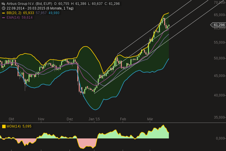 ein paar worte zum chart : ich interpretiere den ausflug gg 64 mal als fehlausbruch - weil er schnell wieder eingeholt wurde und der kurs zurück in den stimmigen trendkanal rutschte. das läuft alles noch ziemlich bullisch - momentum stark, aber kursgerecht. der wert läuft noch über ema , mbb und weiterhin über der mitte des letzten trendkanals. das ist alles stimmig und deutet vorerst auf keine alarmsignale.