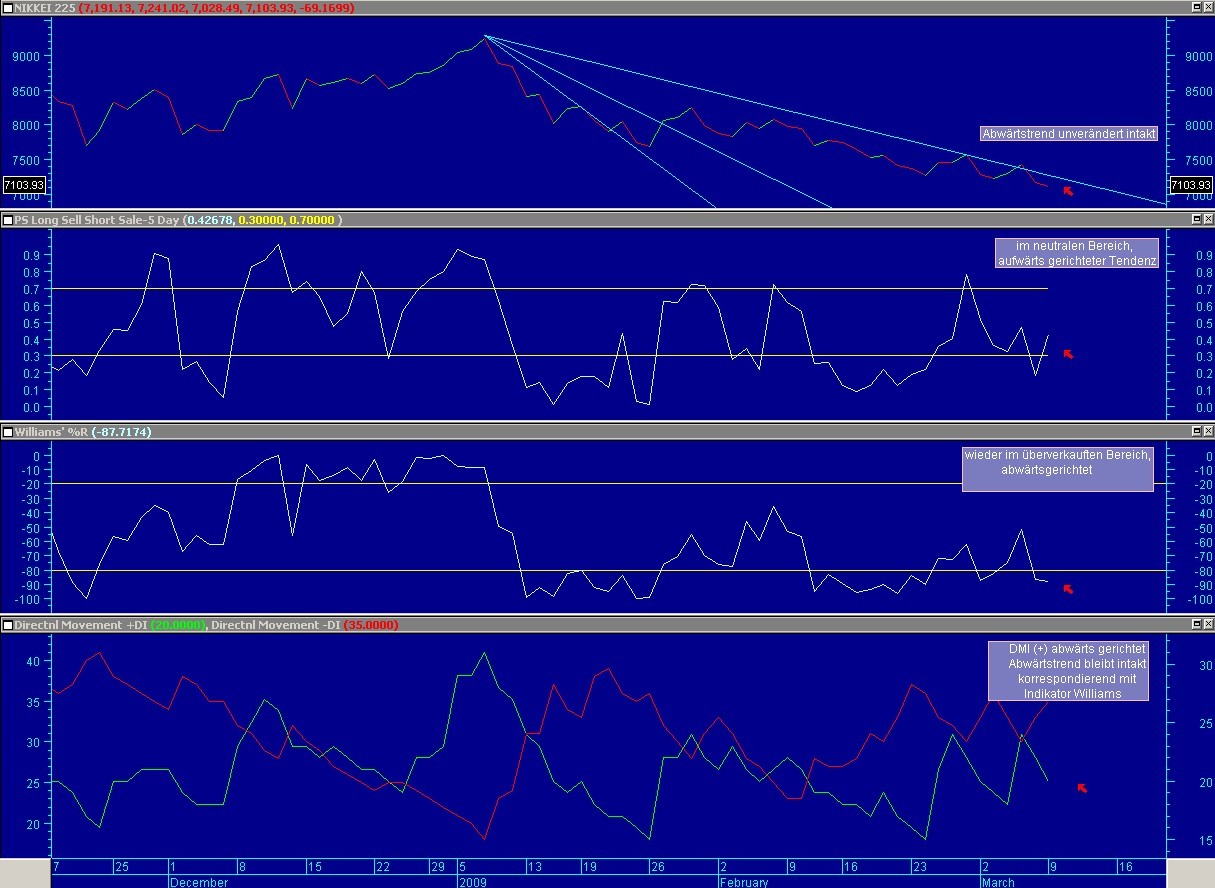 Bei den großen Indices rutscht der DOW JONES mit dem PS Long Sell Short Sale in die überkaufte Zone, wird aber noch nicht bestätigt von Williams und DMI(+) - beide noch in der Aufwärtsbewegung. Anders dagegen der DAX. Er ist beim PS bereits in der überkauften Zone, beim Williams noch im neutralen Bereich, dagegen ist der DMI(+) bereits wieder abwärtsgerichtet - Divergenzen mahnen zur Vorsicht und besonderen Beobachtung. Der Hang Seng läßt weitere Kurssteigerungen vermuten, sämtliche Indikatoren aufwärts gerichtet. Das gleiche Bild findet man auch beim Nikkei. Insgesamt deuten sich wohl Tendenzen für Kurserholungspausen und somit für Gewinnmitnahmen an.