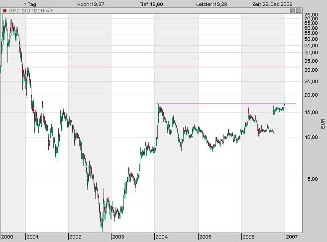 Das in Martinsried bei München ansässige Unternehmen sei eine der größten Erfolgsgeschichten in der deutschen Krebsforschung. Das Präparat Satraplatin zur Behandlung von Prostatakrebs stehe kurz vor der Markteinführung. Das Medikament könnte zu einem Blockbuster werden. GPC Biotech wolle mit der Akquisition von Vermögenswerten von Axxima Pharmaceuticals die Medikamententwicklung erweitern. Obwohl der Aktienkurs stark zugelegt habe, habe er insbesondere wegen Satraplatin erhebliches Potenzial.