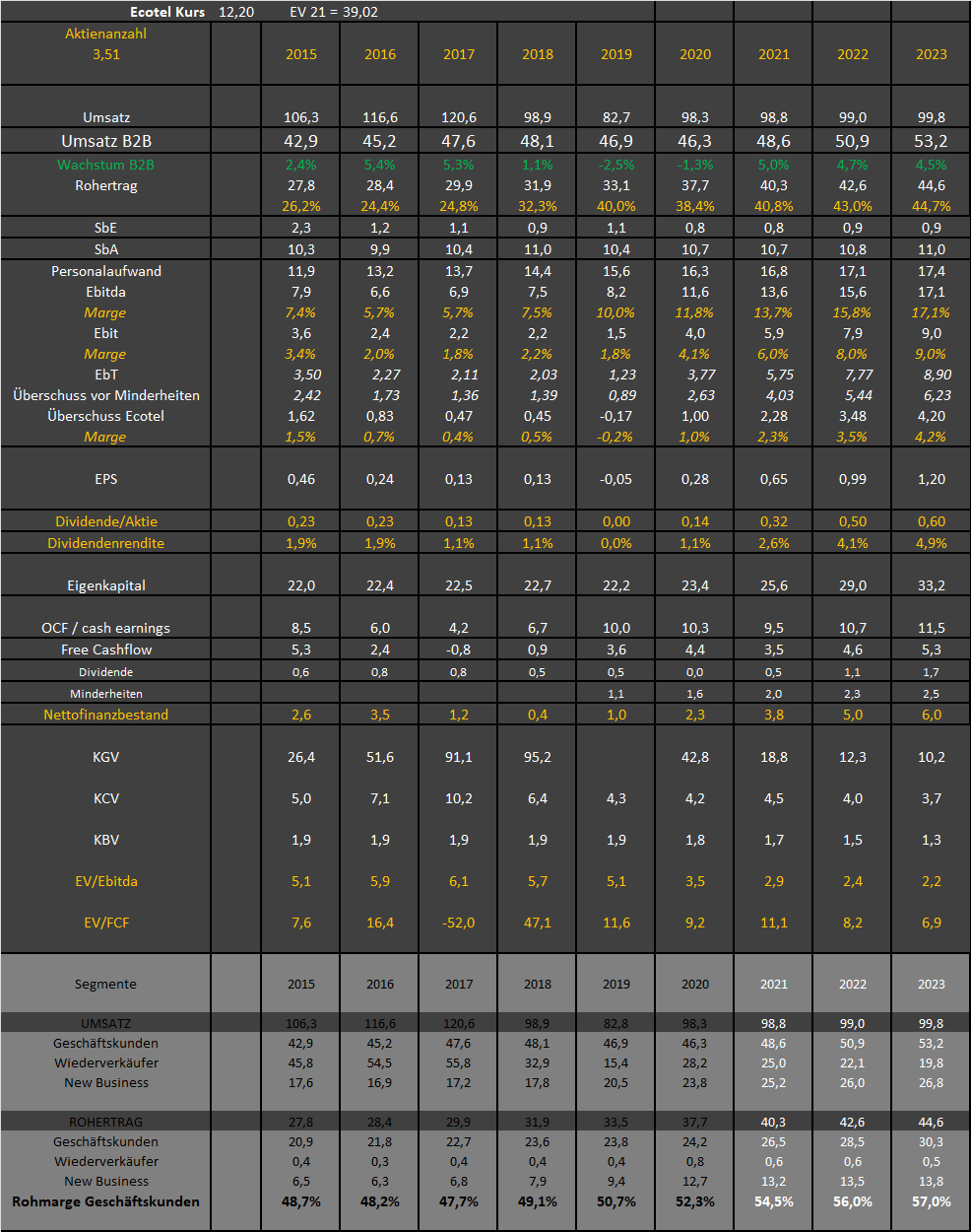 Die Vorstände haben, meiner Meinung nach, sehr gut die Potentiale aufgezeigt, die mit der beschleunigten Digitalisierung auf Kundenseite verbunden sind. Der Wegfall der ISDN Kanäle sorgt für leicht steigenden Rohertrag. Ich sehe die Gesellschaft sehr gut positioniert, um von dem Digitalisierungsschub zu profitieren und endlich auf nachhaltiges, profitables, Wachstum zu kommen. Es sollen weiterhin mindestens 50% des Ergebnis, nach Minderheiten, als Dividende ausgeschüttet werden. Für dieses Jahr sind ca. 1 EUR möglich, d.h. 50 Cent Dividende sind in 2022 drin, immerhin 2,50%, beim aktuellen Kurs.