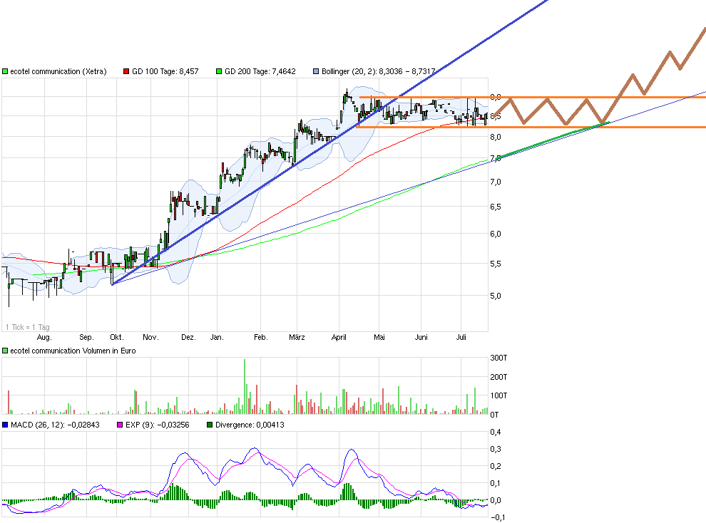 Im Oktober dürfte dann die 200TL bei 8,2 € verlaufen. Deshalb ist das bei meiner Hypothese sozusagen der Aufsetzpunkt für einen sich danach etablierenden Aufwärtstrend, der dann auch mal längere Zeit (12-18 Monate) halten kann, weil nicht zu steil und nicht zu flach, entsprechend dem Kurspotenzial von Ecotel.