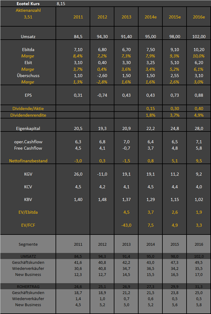 Kann sich ja mal jeder selbst die Kostenstruktur anschauen, wenn der Umsatz in beiden Bereichen Geschäftskunden und New Business nur um jeweils 5% steigt. Dann steigt der Gesamtumsatz zwar nur etwa 4% von 95 Mio € auf 99 Mio €, aber das Ebitda gleich mal um etwa 20%. Und das ist ja durch den Allianzauftrag fast vorprogrammiert.