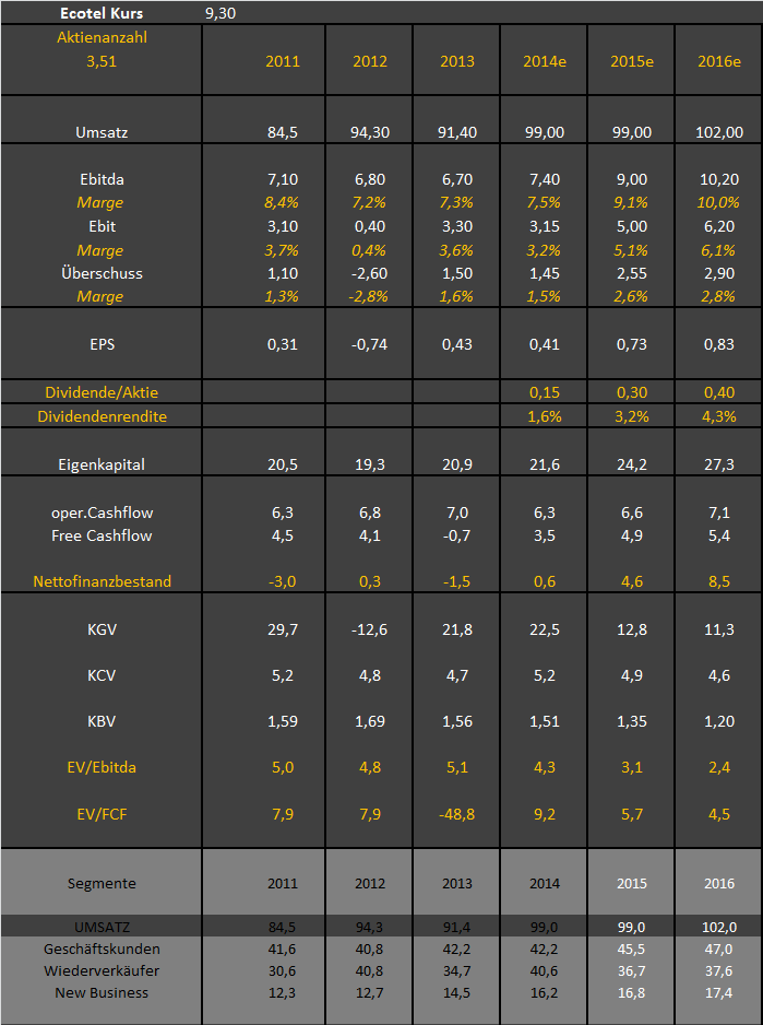 Aber wie kommst du denn zu der Aussage mit der 9% Ebit-Marge? Ich vermute mal, du hast dich da verschrieben und meintest 9% Ebitda-Marge. Aber auch in dem Fall ist doch kein doppelt so hoher Umsatz im Geschäftskundensegment nötig wie im Wiederverkäuferbereich. Ich erwarte in diesem Jahr 42,0-42,2 Mio Umsatz und 20,0-20,4 Mio Rohertrag in dem Segment bGeschäftskunden. Angenommen im nächsten Jahr wächst der Umsatz um 3,3 Mio € durch die Allianzkunden. Der Rollout ist ja gerade erst beendet. Jetzt geht es ans ernten. Weiter angenommen bei 3,3 Mio mehr Umsatz steigt der Rohertrag um 1,6-1,7 Mio €, dann muss man doch nicht doppelt so viel Umsatz machen wie im Wiederverkäuferbereich, um auf 9% Ebitda-Marge zu kommen. Ein Verhältnis von 46 Mio zu 36 Mio € würde schon reichen. New Business hat übrigens auch keine schlechte Marge. Und da geht es seit 2012 ja deutlich voran. Selbst wenn sich da das Wachstum auf von über 12% auf rund 5% abschwächt, sollte es unterstützend für die Konzernmarge wirken.