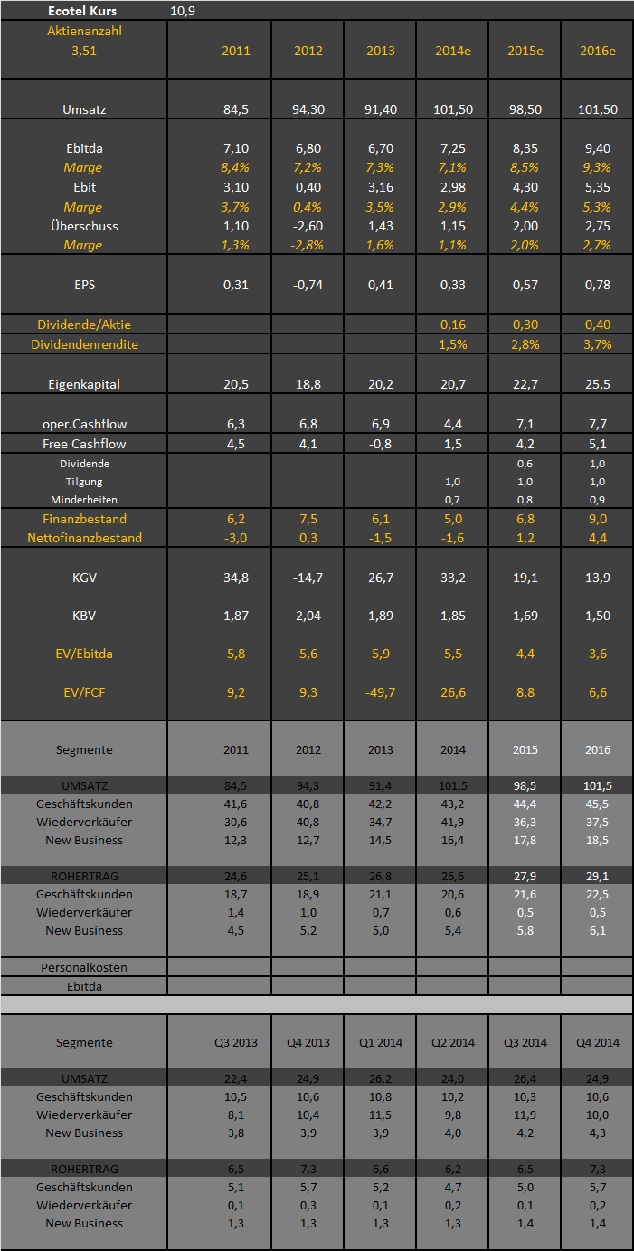 Na ja, Ecotel muss jetzt beweisen, in den margenstarken Bereichen Geschäftskunden und NewBusiness weiter zu wachsen. In den letzten zwei Quartalen ist das ja bereits gelungen, trotz den 0,8 Mio weniger Umsatz bei nacamar. Easybell entwickelt sich hervorragend, und auch im Geschäftskundenbereich scheint es erste kleinere Erfolge des Allianzauftrags zu geben, was man an der Quartalsentwicklung seit dem 1.Halbjahr erkennt. Jetzt muss da halt der Umsatz auf Jahresbasis 2015 vorankommen, was bei unterdurchschnittlich steigenden Kosten zu deutlich anziehendem Ebitda führen wird. Nacamar ist im NB-Segment dann sozusagen noch ein Joker, der bei sehr gutem Verlauf der Restrukturierung das Konzern-Ebitda auch auf mehr als 8,5 Mio führen kann, aber ich nehme an, das hat der Vorstand seriöserweise nicht berücksichtigt.