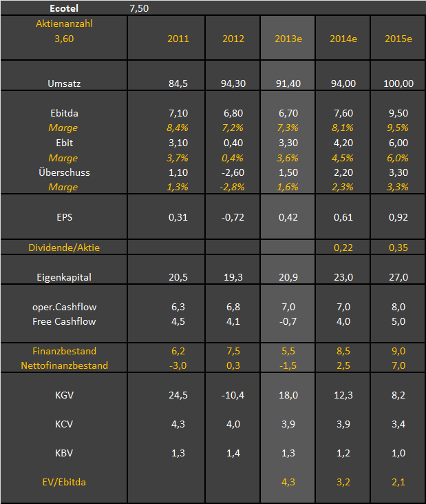 Im Normalfall performen unterbewertete Aktien den Markt aber auch in so einer Korrekturphase deutlich aus. Kann zwar verstehen, wenn manch Kleinanleger da lieber Gewinne mitnimmt, wenn er sieht wie der Dax abschmiert, aber erstens sollte man Ecotel schon gesondert berachten, zumal man die Korrektur des Dax längst prozentual mitgemacht hat. Und zweitens ist ja gar nicht gesagt, dass die Märkte deutlich tiefer fallen. In Dax und Dow haben wir knapp 1,5-2,0% unter den aktuellen Niveaus starke Unterstützungszonen, wo die Märkte deutlich nach oben drehen könnten. Allein schon deshalb würd ich konjunkturunabhängige ud sehr günstig bewertete Aktien wie Ecotel jetzt nicht mehr verkaufen. Zumal es hier noch ne Menge Trigger für den Kurs gibt, die kaum einer auf der Rechnung hat. Über zukünftige Dividenden wird bisher so gut wie gar nicht geredet. ich bin mir aber sicher, dass Ecotel ab 2014 (auszahlbar in 2015) zu einem ähnlichen Dividendentitel werden kann wie Drillisch, denn wo soll Ecotel denn mit der Kohle hin, die man ab sofort generiert? Anorganisches Wachstum? Glaub ich nich so wirklich dran, und fänd ich auch nur gut wenn es sich finanziell richtig durch Synergien oder geringen Kaufpreis lohnt. Ecotel ist für mich prädestiniert, um ab kommenden Jahr hohe Dividenden auszuschütten.