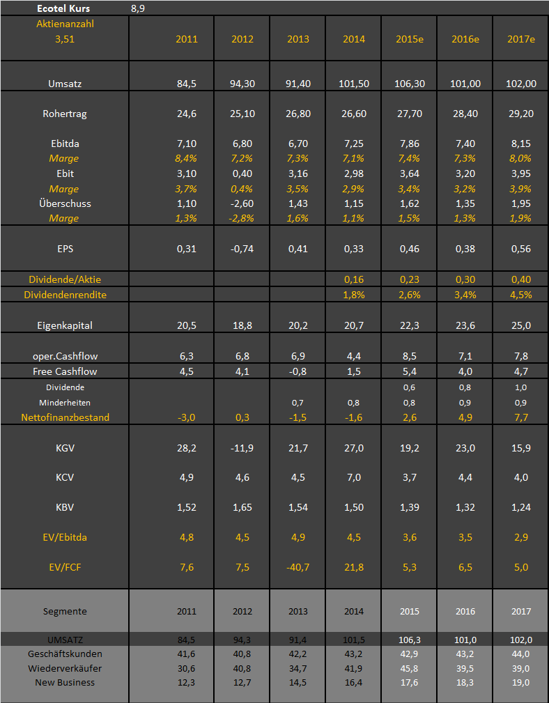 Im Moment stecken leider einige Risiken in der Sache drin. New Business ist angesichts der jüngsten Ereignisse und der Aussagen im Geschäftsbericht bis auf weiteres leider etwas eine Black Box. Geschäftskunden ist solider. Allerdings ist ecotel in meinen Augen einfach zu klein. Mit der bestehenden Größe werden sie in dem Umfeld immer wieder Probleme mit "Einmalkosten", "nötigen Investments" und "unerwartetem Verlust eines Großkunden" etc. haben. Sprich: nicht alles was einem als "free" cash flow verkauft wird ist letztlich wirklich "free".