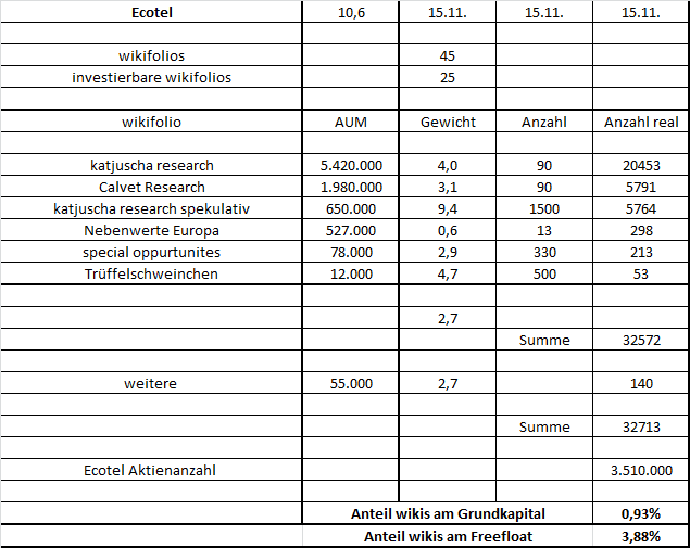 Jedenfalls hab ich bei den obigen 45k natürlich nur die Aktien in den wikifolios direkt berechnet. Das ist so schwer nicht. Man gibt einfach nur die WKN in die wikifolio Suche und guckt sich dann die 10 größten wikifolios mit Ecotel an und nimmt dann nochmal pauschal für die restlichen Wikifolios eine Gewichtung an.