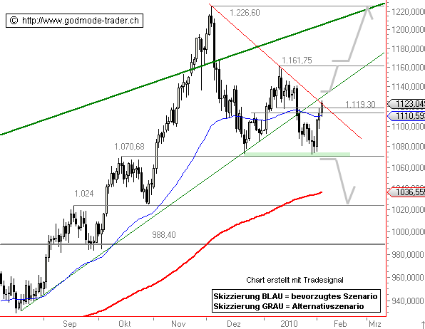 www.godmode-trader.de/nachricht/...oldmarkt,a2054613,b605.htmlKaum hat der Goldpreis von seinem vor gut einem Monat erreichten Allzeithoch bei 1.218 US-Dollar für die Feinunze bis kurz vor Weihnachten wieder bis auf 1.075 US-Dollar nachgegeben, da könnte die Korrektur schon wieder vorbei sein. Davon geht zumindest Werner J. Ullmann, Rohstoff-Experte von ERA Resources aus: „Im Januar wird Gold seinen langfristigen Aufwärtstrend fortsetzen und an die erfolgreiche Vorjahresentwicklung anknüpfen.“ Nicht ganz so optimistisch zumindest kurzfristig, zeigt man sich bei der Commerzbank. Danach mahnen unter anderem extrem hohe spekulative Netto-Long-Positionen an der COMEX derzeit zur Vorsicht, was die Analysten zu der Ansicht verleitet, das Dezembertief könnte beim Goldpreis noch einmal angetestet werden. Harald Weygand, Head of Trading bei Godmode-Trader.de geht noch einen Schritt weiter und hält bei dem Edelmetall trotz seiner langfristig bullischen Einschätzung mittelfristig an Korrekturzielen von 1.020 und 950 US-Dollar fest. Bestärkt wird er dabei durch die bislang sehr stabile gegenläufige Korrelation zwischen der Entwicklung von Goldpreis und US-Dollar, bei dem er eine weitere Erholung erwartet. Der kürzliche Wiederanstieg beim gelben Metall lässt sich neben den sehr starken chinesischen Konjunkturdaten genau auf diesen Effekt zurückführen. So ging die US-Währung nach dem schwachen US-Arbeitsmarktbericht vom vergangenen Freitag wieder auf Tauchstation, während gleichzeitig der Februar Gold-Futurekontrakt mit 1.159 US-Dollar je Feinunze wieder den höchsten Stand seit einem Monat markieren konnte. Im Verlauf des neuen Jahres hält Weygand aber zumindest eine „Peu-à-peu“-Aufhebung dieser Wechselwirkung für möglich