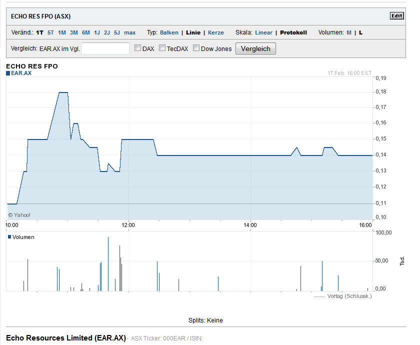 Die Aktie sprang heute Nacht in Aussi Land gleich auf 18 Cent , danach gab es ein paar Gewinnmitnahmen ... Ich bin aber weiterhin sehr positiv gestimmt und denke das wir die alten Hochs bei 24 Cent bald wieder in Angriff nehmen - seht mal den Langfristchart an bei der letzten guten Meldung
