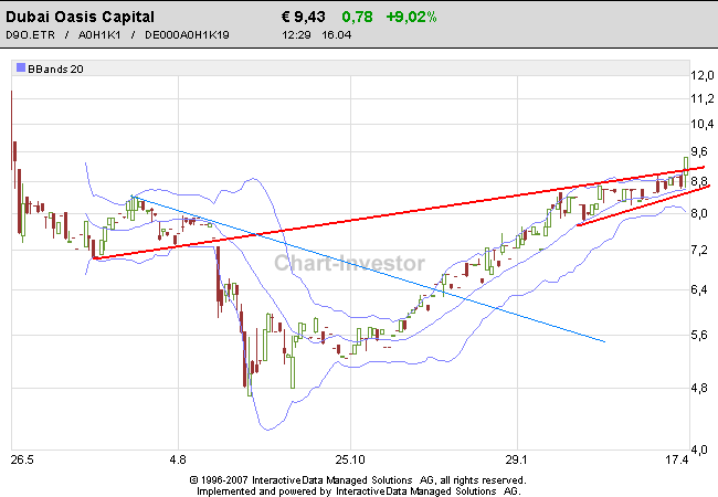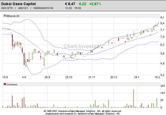Die Experten von performaxx Der Anlegerbrief empfehlen die Aktie von Dubai Oasis Capital (WKN A0H1K1) zumindest auf die Watchlist zu setzen. Die Firma sitzt in einer steuer- und ordnungsrechtlichen „Oase“ der Metropole Dubai und zahlt effektiv nur zwei Prozent Steuern, wenn die Gesellschaft eine Dividende ausschüttet. Wenn das Unternehmen die begehrte Handelslizenz als Asset Manager für fremdes Kapital im Dubai International Financial Centre, kurz DIFC, und die Lizenz als Market Maker für an der Dubaier Börse gelistete Wertpapiere erhält, haben die Papiere eine Perspektive. Das Zulassungsverfahren läuft, doch Dubai hat es nicht nötig auf die Interessen ausländischer Antragsteller einzugehen. Dubai Oasis verfügt bei einem Aktienkurs von 5,40 Euro über rund zwei Euro an liquiden Mitteln. Es wird darauf spekuliert, dass die Firma 2006 etwa einen Euro je Anteilschein verdienen könnte und eine Dividende von bis zu 50 Cent ausschütten. Im ersten Halbjahr hat Dubai Oasis schon 50 Cent je Aktie verdient.