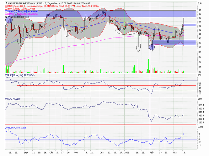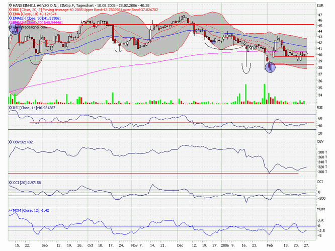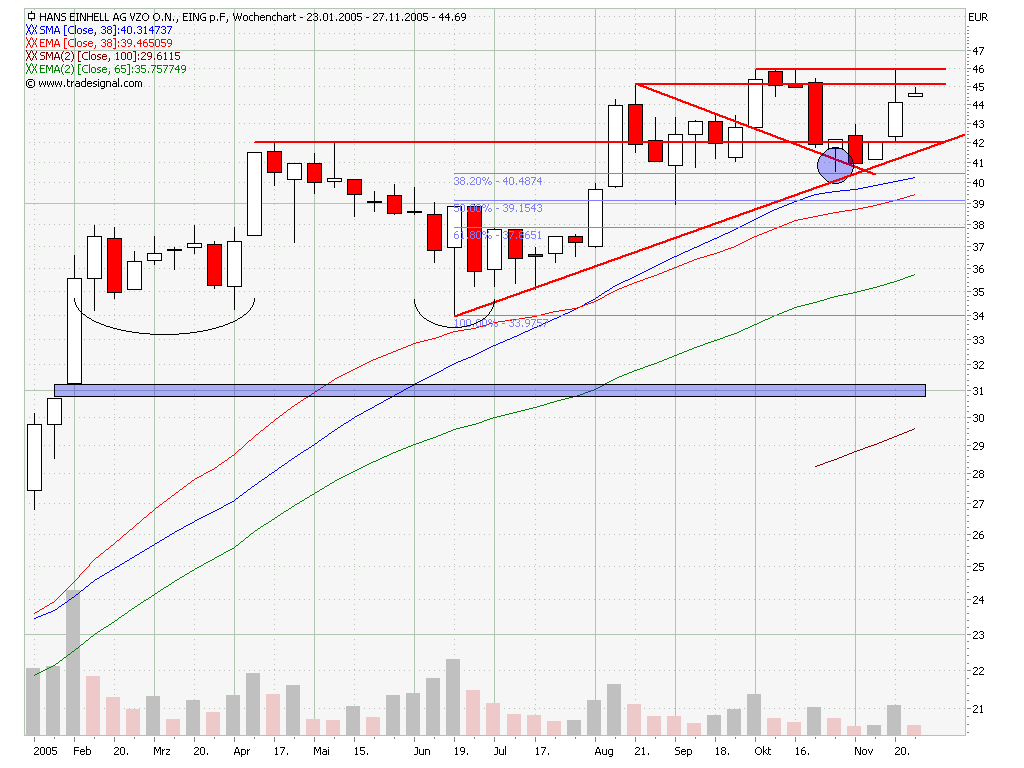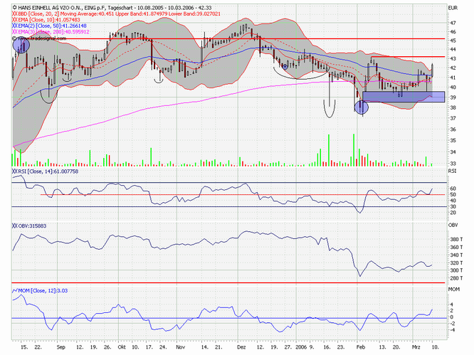 Die Umkehrformation würde dann vollendet, wenn der Aktienkurs unter die Marke von 34,00 Euro fällt: Hier verläuft die so genannte Nackenlinie der Formation. Vorsichtige Investoren bringen schon jetzt ihre Gewinne unter Dach und Fach.