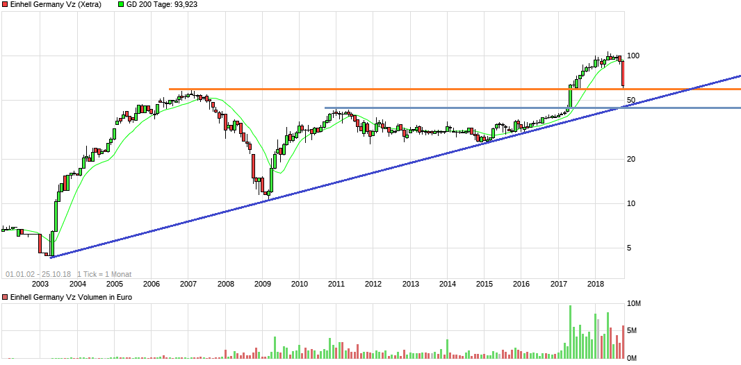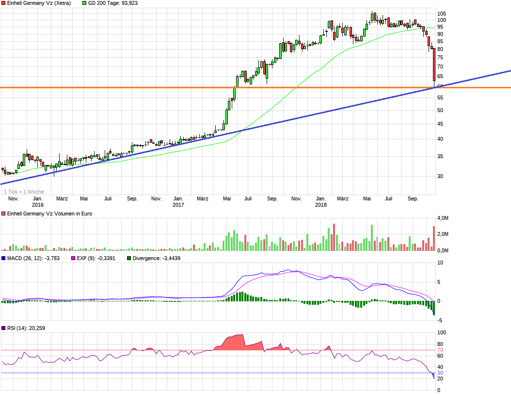 Einhell war im Sommer brutalst überkauft, wie man sehen kann. Und je brutaler ein Wert überkauft ist, desto höher ist danach die Fallhöhe in der überfälligen Korrektur, die wieder die Überhitzung abbauen soll. Von daher ist auch bei vielen Tech-Werten die deutliche Korrektur z.Z. ein Folge der deutlichen Überhitzung in der Vorzeit. Nur wird es von vielen Leute gerne als "normal" angesehen, wenn sich Werte in kurzer Zeit vervielfachen, es aber als als quasi skandalös angesehen, wenn man nach z.B. 400-500% Anstieg auch wieder 40-50% verliert. Was z.T. auch daran liegt, daß viele Leute erst aufspringen, wenn der brutale Anstieg schon gelaufen ist, weil sie dann meinen die Lieblinge der Vorzeit laufen so immer weiter. So ist eben Börse. Ein Auf und Ab an Übertreibung nach unten und nach oben. Da muß man mental flexibel bleiben, Frühwarnsignale registrieren und nicht eindimensional meinen es geht nur aufwärts, weil man es sich wünscht. Den Fehler haben viele Leute schon zu oft gemacht. Ist halt auch eine Typ- bzw- Charakterfrage. Wenn man zulange eine Hausse hat, dann sind manche Leute eben eingelullt von den Anstiegen und sehe zu lange keine Anzeichen für eine Umkehr der Situation. Quasi eine Art Boiling Frog Syndrom. Da spielt es keine Rolle, ob man 2 Jahre oder 20 Jahre an der Börse ist. Wer diesen Instinkt nicht hat, der läuft dann stets mit viel zu hoher Aktienquote und ohne Hedge immer wieder in die gleiche mentale Falle. Vielleicht übertreibt man jetzt bei Einhell nach unten. Kann aber noch keiner absehen wie weit und ob es wirklich ohne fundamentale Gründe erfolgt. Da muß man laufend weiter schauen, wie die Wachstumsdynamik die nächsten Quartale noch anhält. Im unteren 60er Bereich liegt jedenfalls eine sehr starke horizontale Unterstützung. Ob man die wirklich ansteuert wird sich zeigen. Denke dafür müßte schon einiges an Panik noch hinzukommen am Markt. Man sollte daher auch nicht sklavisch meinen die Marke kommt. Letztendlich bleibt nur weiter auf neue Fakten von der Firma und politisch/konjukturelle Dinge zu schauen und die CT genau im Auge behalten. Noch liegen jedenfalls keine Umkehrsignale wieder vor.