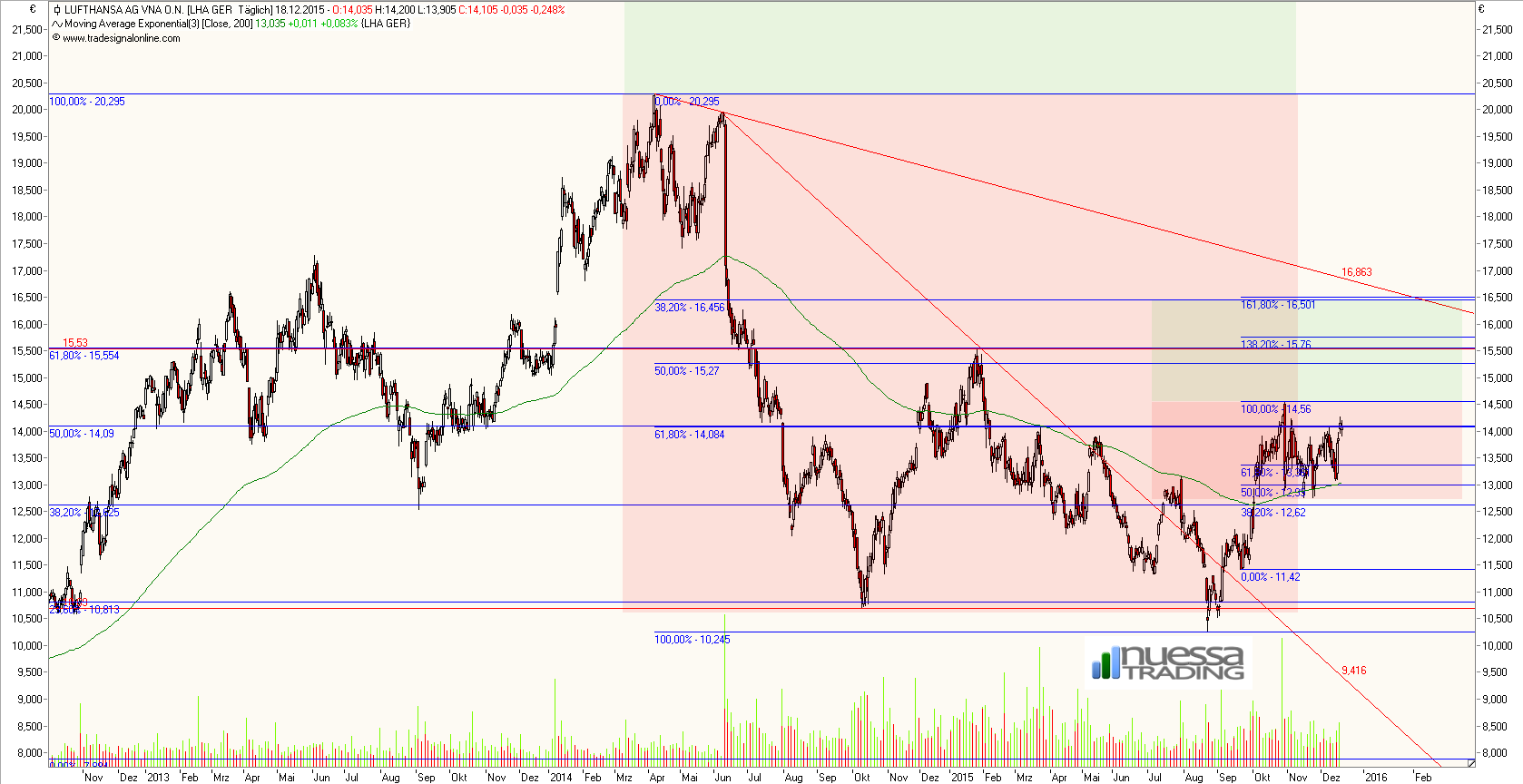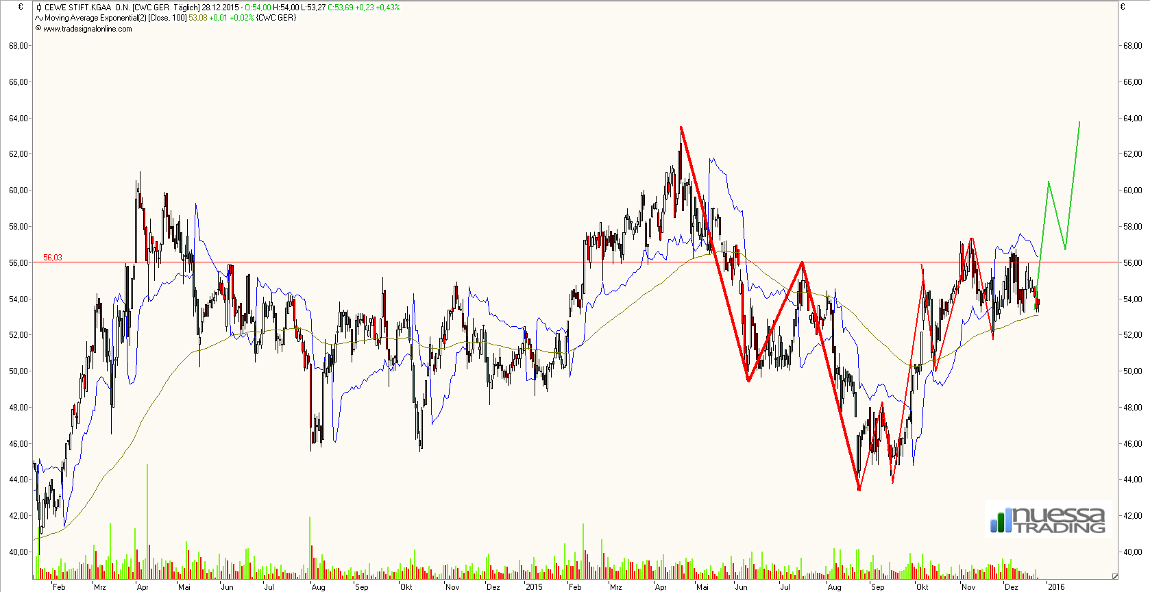 Die Aktie befindet sich seit Emission in einem stabilen Aufwärtstrend. Seit Juli wurde die vorangegangene Bewegung korrigiert am 02.11.2015 habe ich eine Anfangsposition zu 31,94 € eröffnet, welche ich dann am 02.12.2015 um 20% vergrößert habe. Der StoppLoss ist von anfangs 26,40 € auf nunmehr 29,60 € nachgezogen worden. Als Zielzone für den Trade erwarte ich in etwa Kurse um 41 €. Sollte dies dann so auch eintreten ergibt sich ein C/R von anfangs 1,63 und mittlerweile ein C/R von 3,8. Was für einen Trendhandel unter Anbetracht der ehr hohen Trefferquote sehr gut ist.