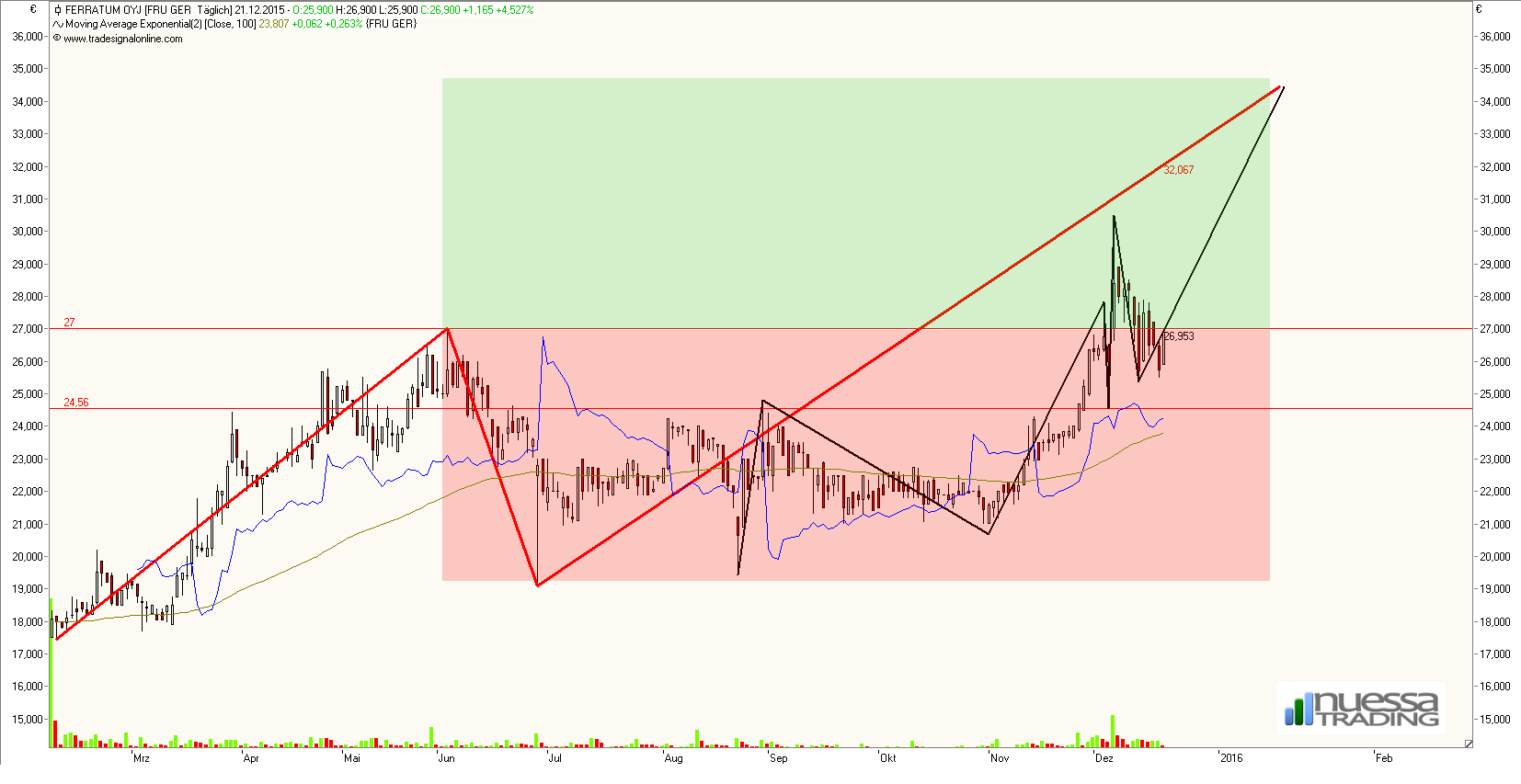 Mit meinem Wikifolio (http://www.wikifolio.com/de/130285) nutzte ich die Chance zum Einstieg und bin mit einem Durchschnittskurs von 27,71 € mit dabei. Als Ziel sehe ich zunächst die 34 €. Absichern werde ich meine Position einfach unterhalb dieser „Monsterkerze“ bei 24,30 €.