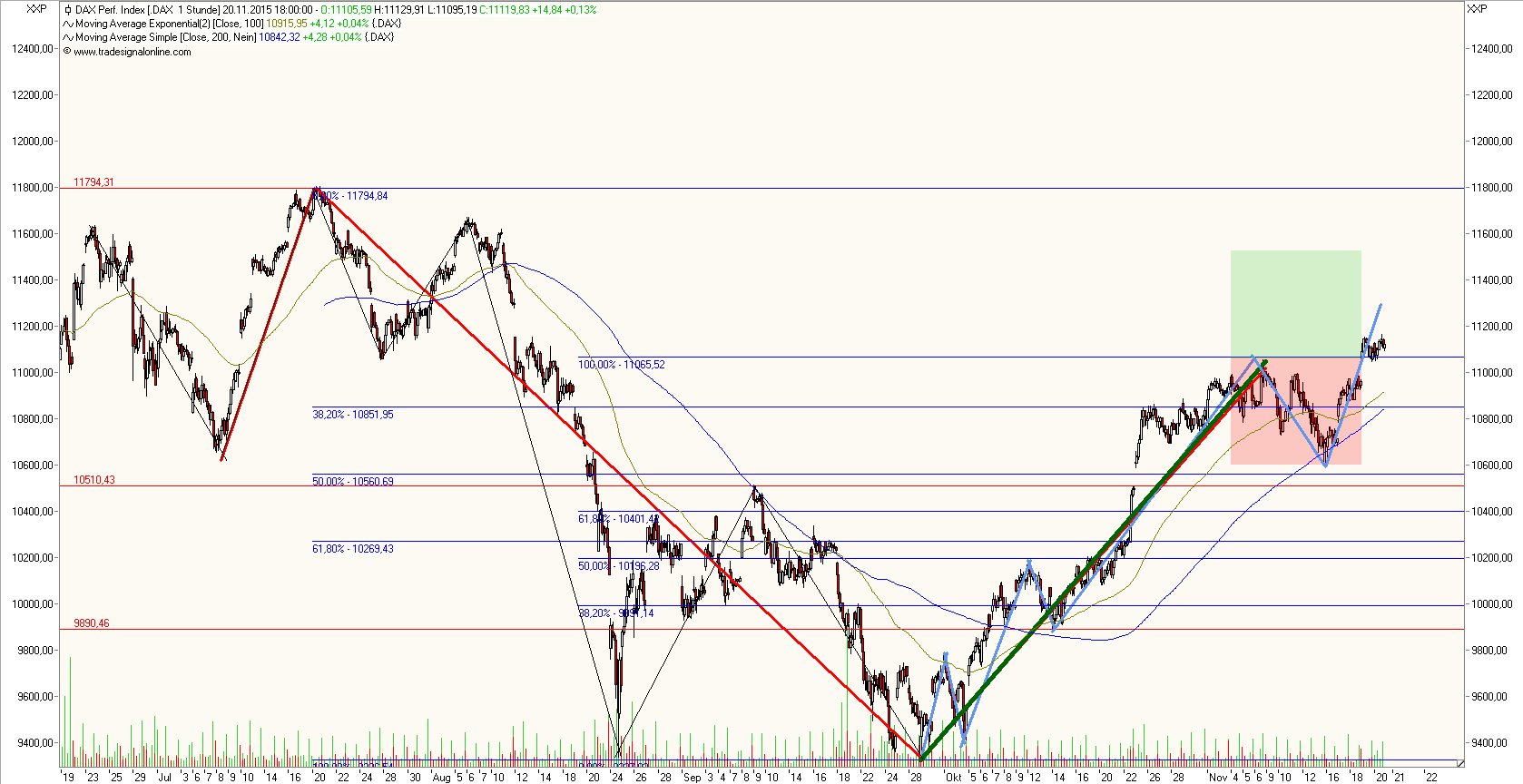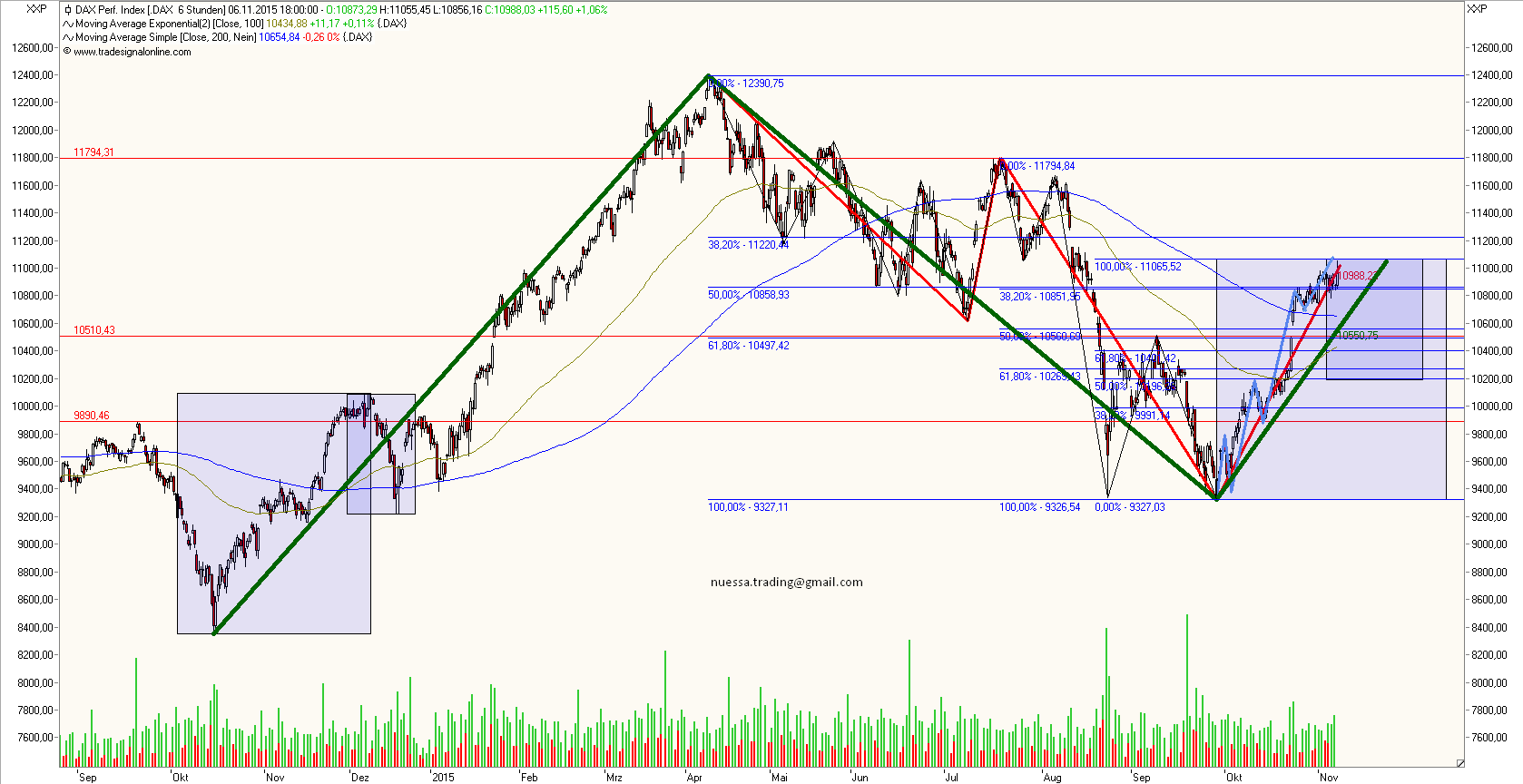 Erwartungsgemäß hat sich der Aufwärtstrend im Dax fortgesetzt, dass anvisierte Ziel von 11.500 Punkten ist nicht mehr fern. Dementsprechend empfehle ich bereits angelaufene Buchgewinne entsprechend der gehandelten Zeiteinheit abzusichern.