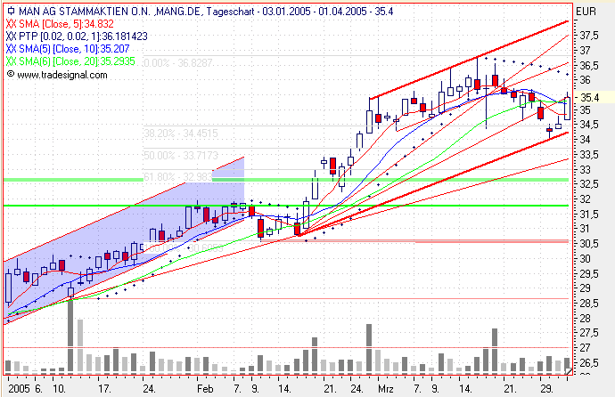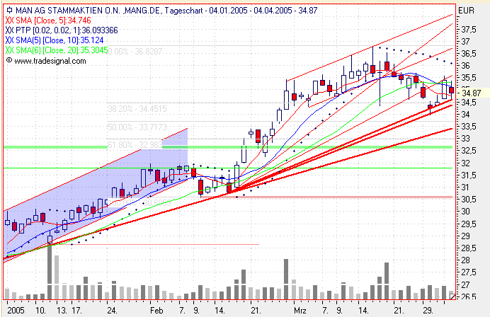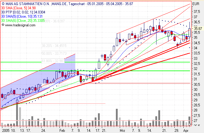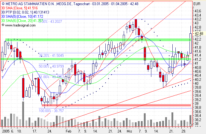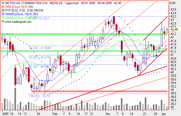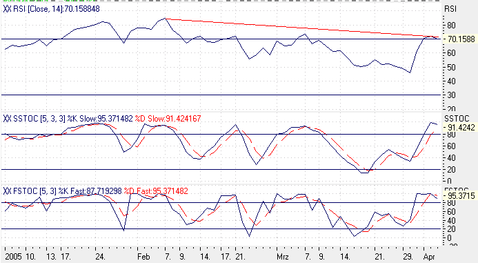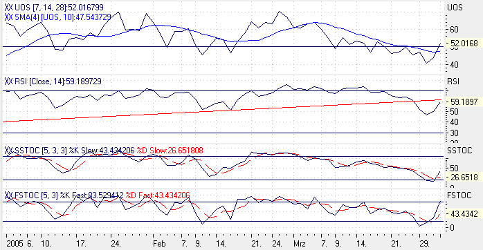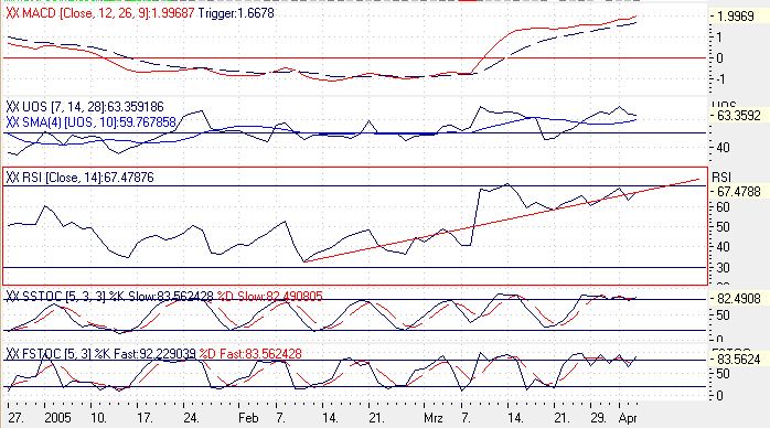 Sieht zunächst einmal so aus als sei die obere Begrenzung der Tradingrange nocheinmal bestätigt worden. Die stochs haben nach unten gedreht, nicht jedoch rsi. Auch ACD und UOS zeigen kein einheitliches Bild.
