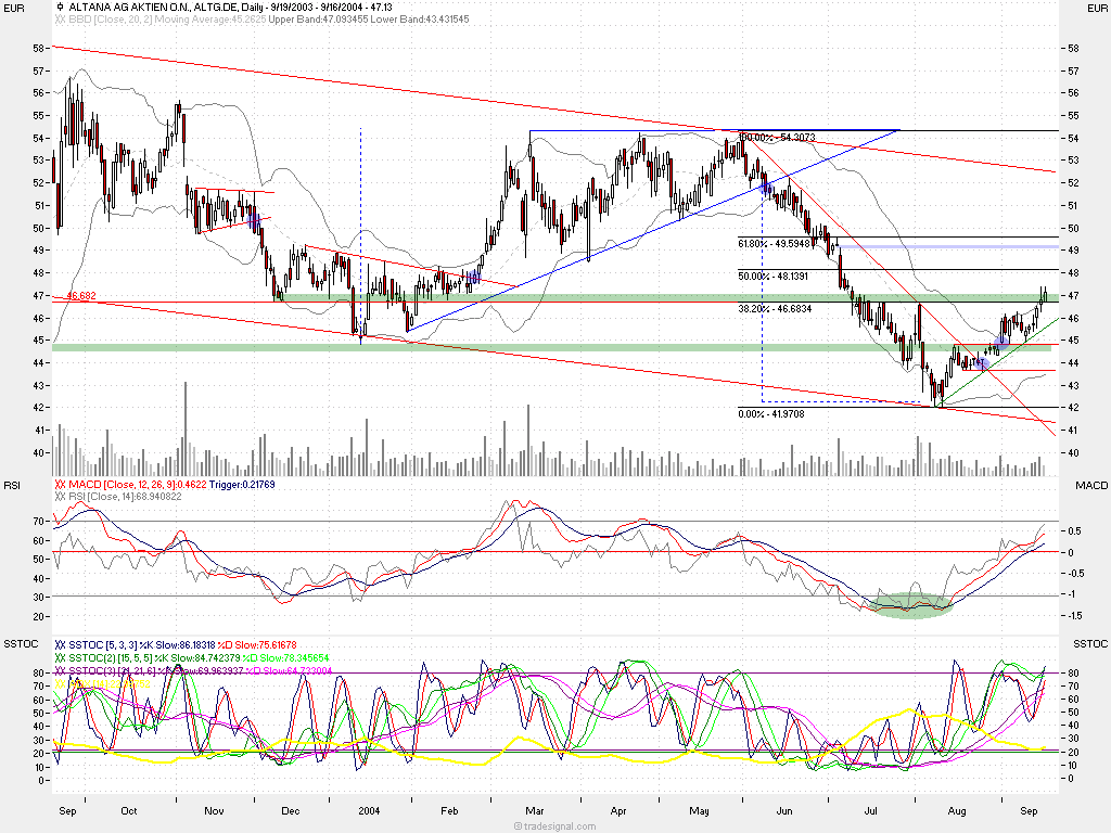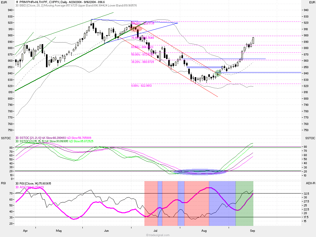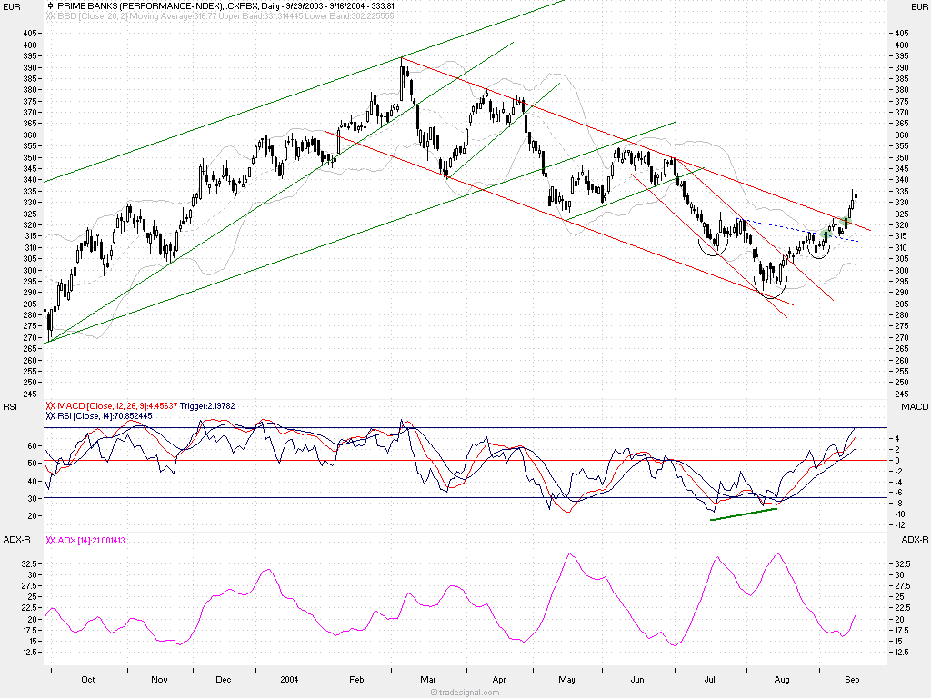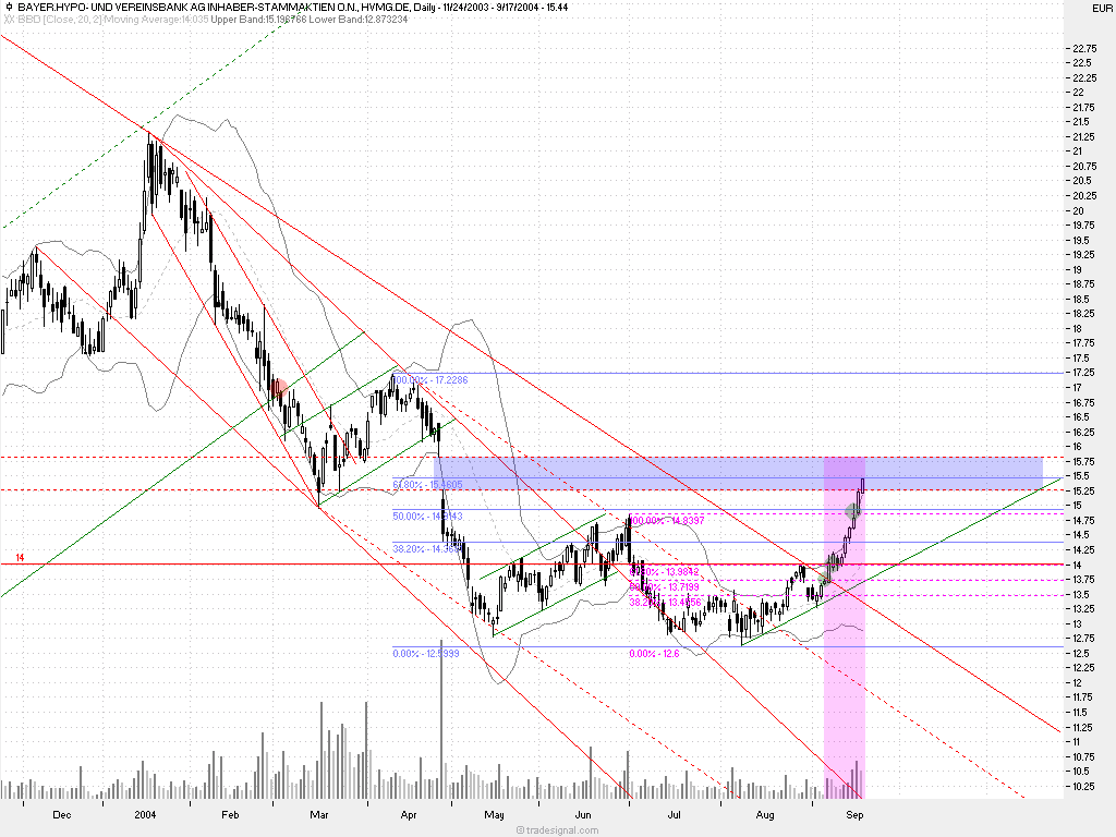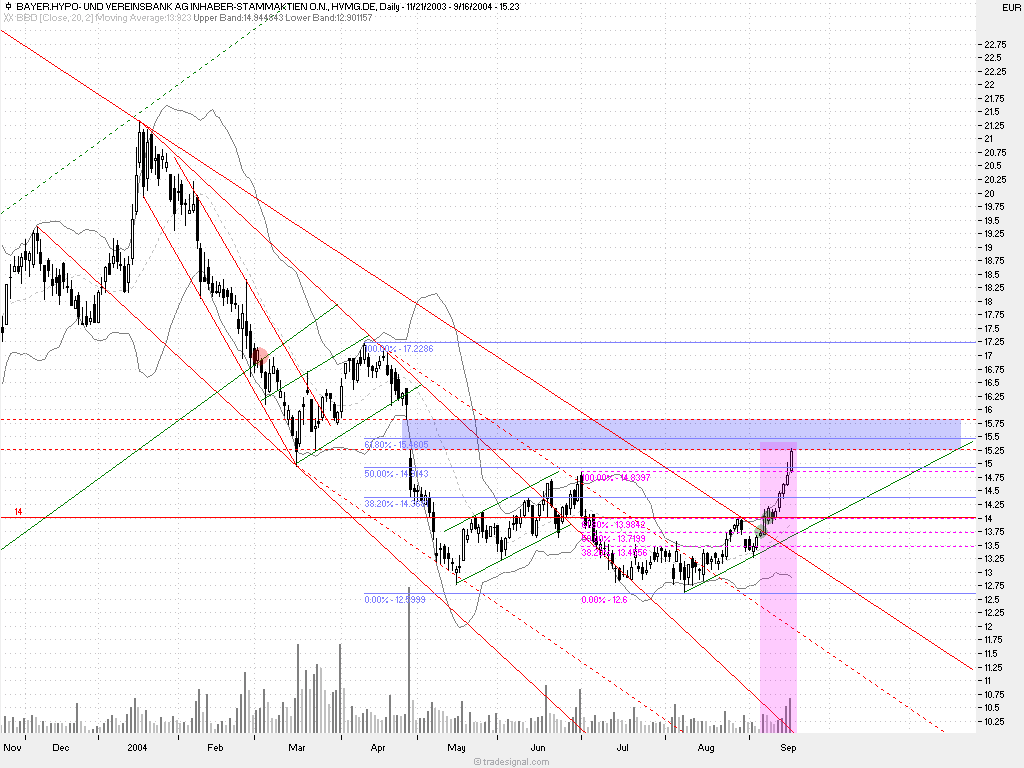 die aktie ist heute mit ihrem bisherign Hoch genau an das 62er retrace gelaufen.. wird auch noch diese marke gebrochen, so scheinen mir die 200tagelinie (15,70) bzw. das gapclosing (15,80) angesagt. man sollte allerdings bemerken dass die aktie nun schon seit 2 handelswochen über 16% gestiegen ist. HVB hat sich wunderbar am oberen bollingerband hochgezogen, und notiert heute sogar komplett überhalb dessen. die trenddynamik ist im deutlich steigendem adx sehr schön zu sehen.. die bankenwerte sind extrem gut gelaufen und ich möchte die position nicht überstrapazieren. hoffe natürlich insgeheim auf ein gapclosing.. dann wären hier die 100% voll.. great ;)