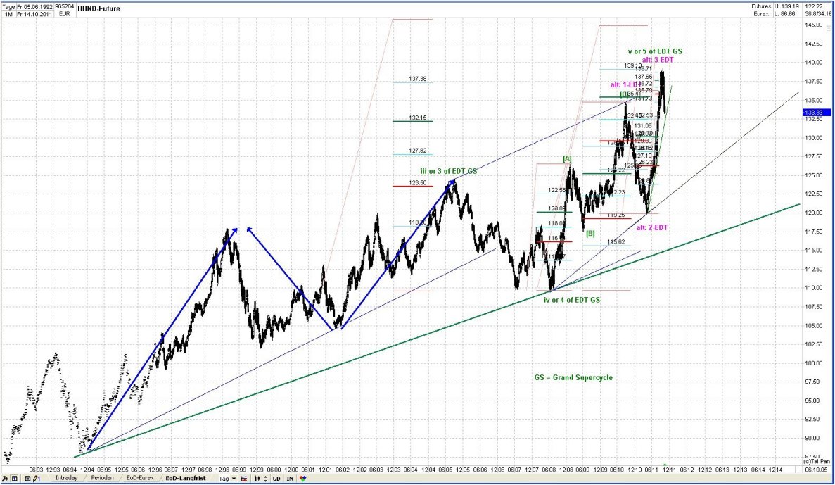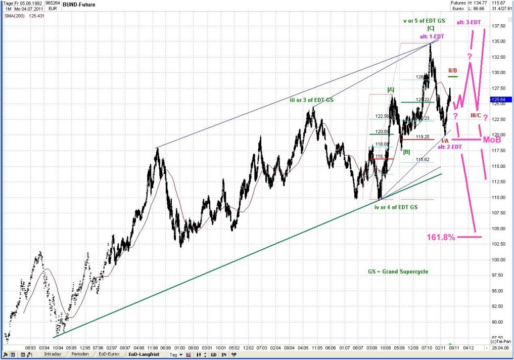 Die ab 110,xx+- laufende Welle wurde als [A] or v of v or 5 of EDT Grand Supercycle eingestuft. Dies bedeutete: solange der BUFU über dem 61.8% Retracement von 116.xx verbleibt, ist nach einer [B] auch noch eine [C] of v or 5 EDT möglich.