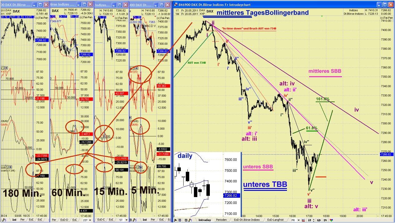 Ob nun ein Impuls abwärts oder aufwärts, ein erstes Signal ist das "in-time"-Retracement der Welle v oder der v' der v. Nimmt man die Welle ab 7332 oder 7324 als Welle v' an, ist die Zeit für ein "in-time up" der v'' der v' (7267-7228) bereits abgelaufen. Es käme also nur ein "in-time up" über 7332/7324 als Möglichkeit in Betracht. Dazu hat der DAX rund 70 Minuten Zeit. Er muß also um 10:10 über 7332 notieren um diese Bedingung zu erfüllen.