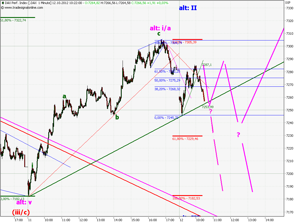Ich muß sagen, das klappt ganz gut. Den Rücklauf abgewartet und nun die C Welle mitnehmen. Ich gehe davon aus, dass der Anstieg von 7247 bis 7284 5-wellig ist und die A darstellt. Somit durfte die B nicht die 61,8% retracen. Paßte.
