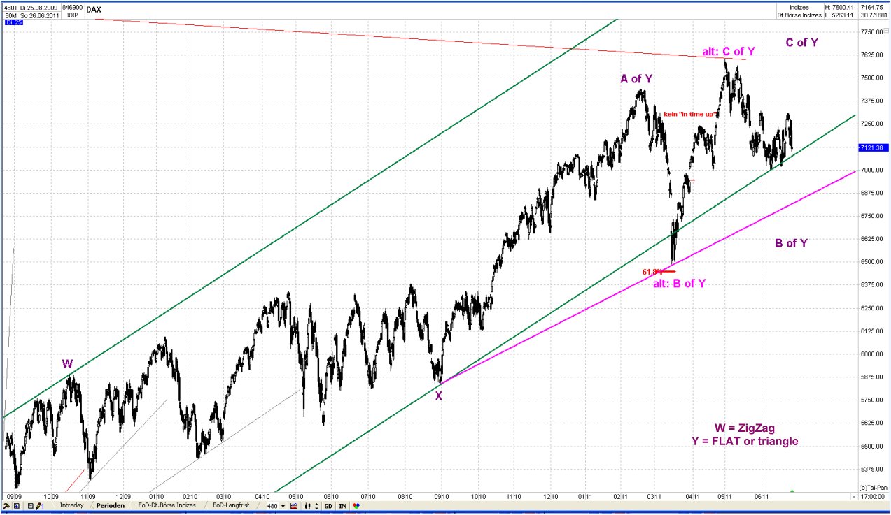 Wie im Chart und in der Jahresanalyse dokumentiert, läuft ab 5833 ein Impuls, dieser lief ab 6835 in einer v''.