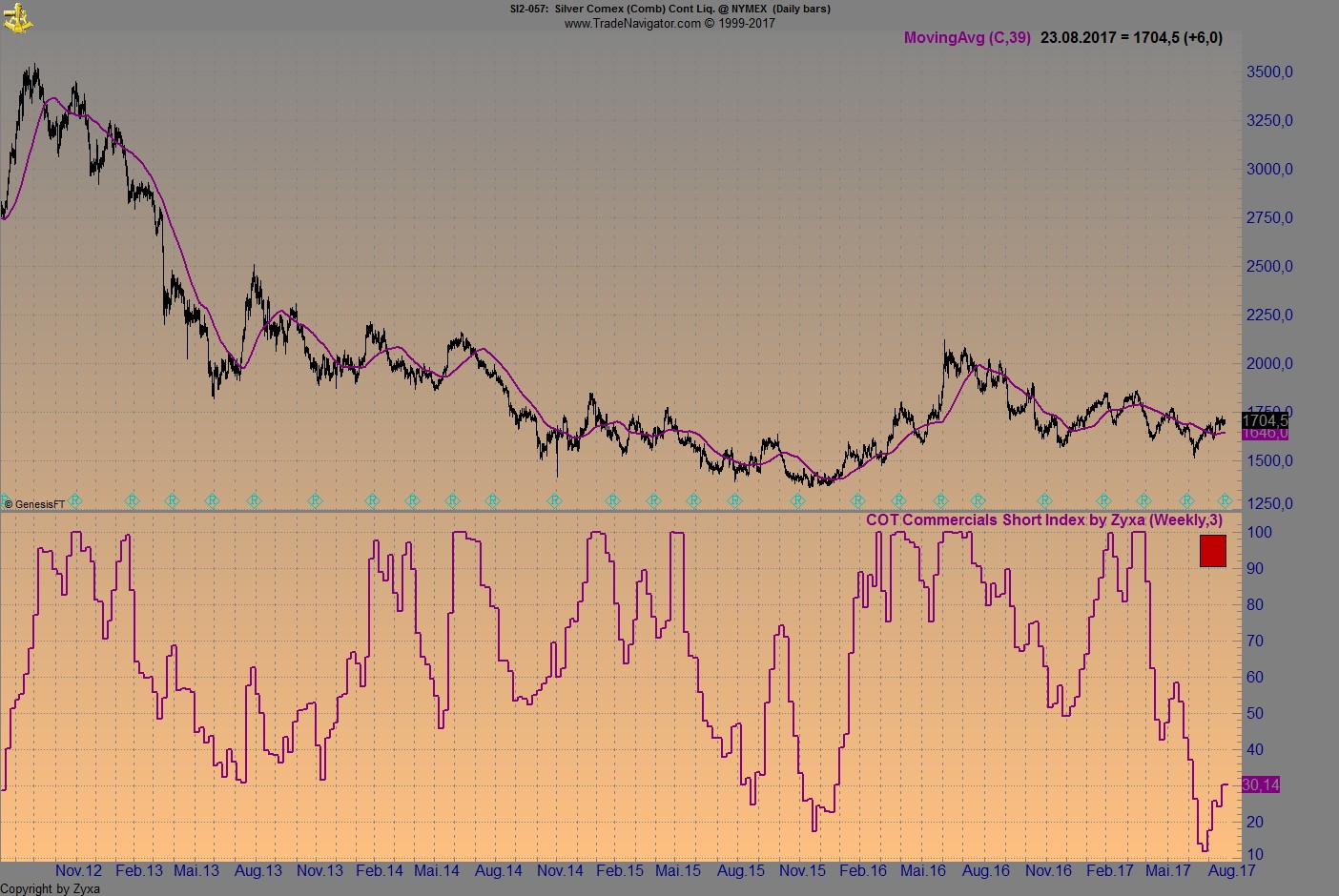 Nun zeigt der Indikator, wie bullisch die Commercials in Verhältnis der letzten 26 Wochen sind.