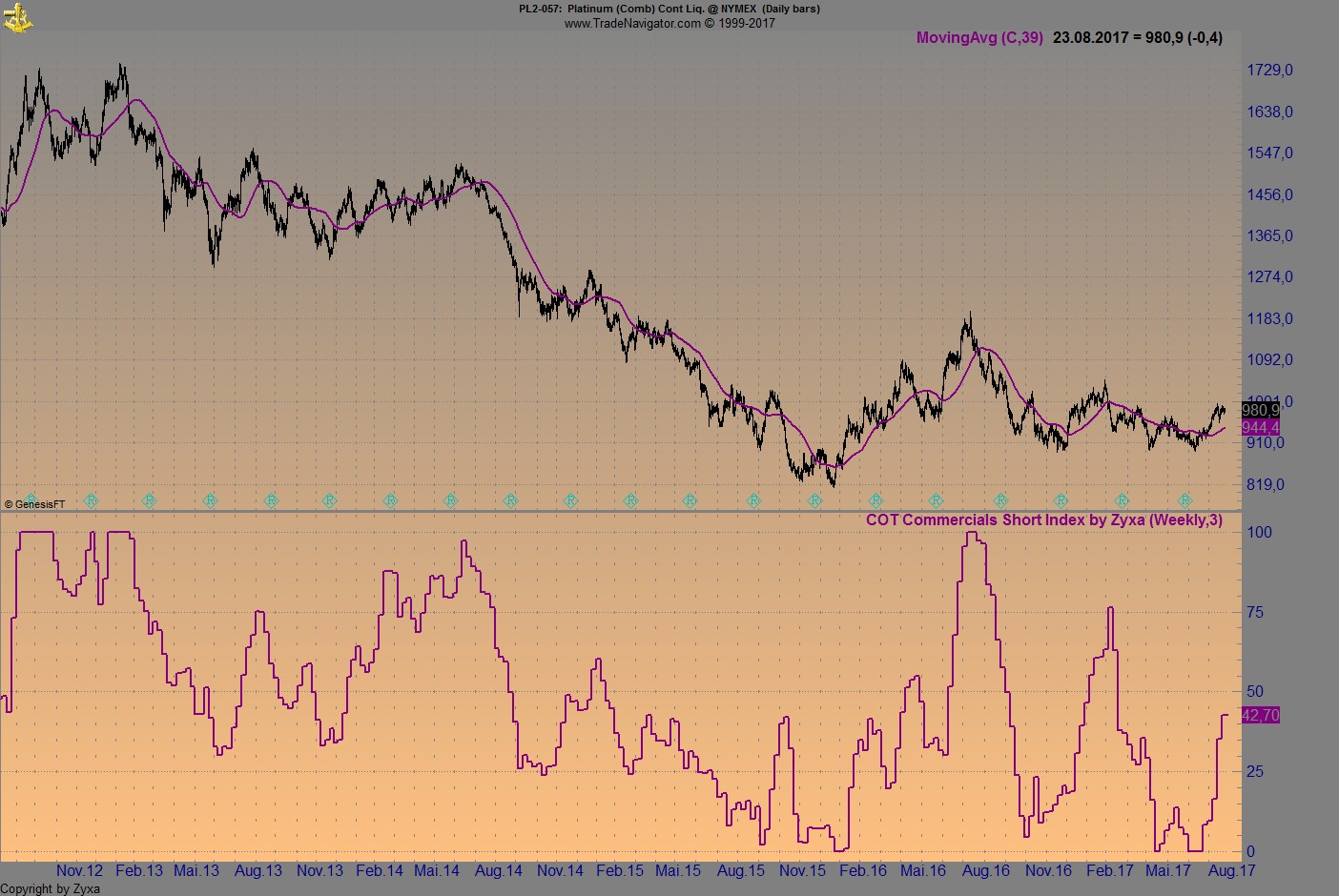 Diese Formel bildet einen Stochastik-Indikator aus der Differenz der Longpositionen minus Shortpositionen der Commercials dividiert durch das GESAMTE open Interest der letzten X Wochen.