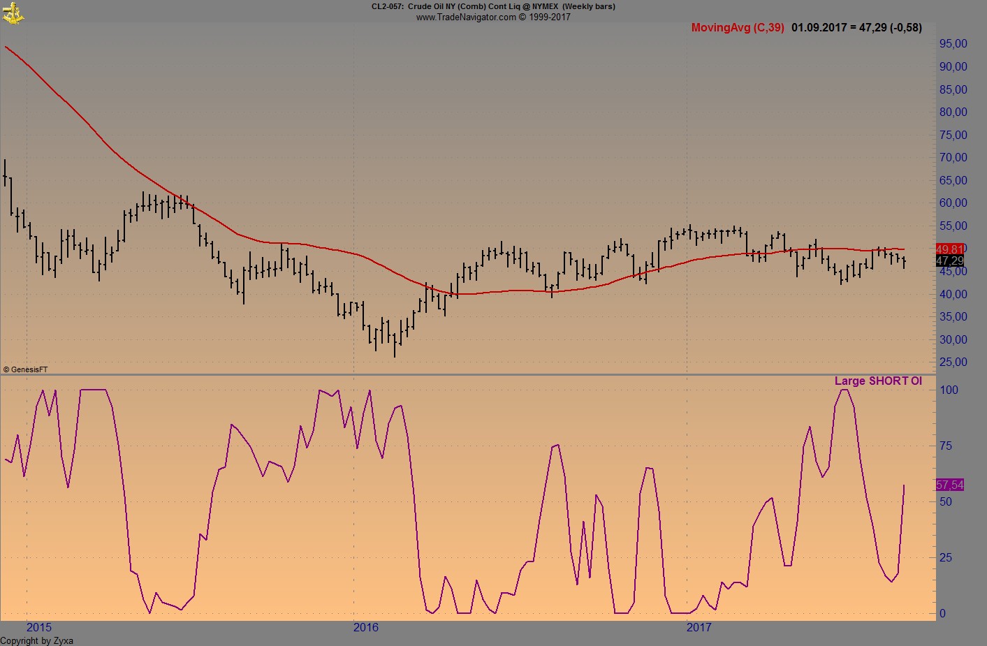 Im Chart jetzt ein Beispiel der Short Aktivität der Fonds in Verhältnis der letzten 26 Wochen bei WTI.