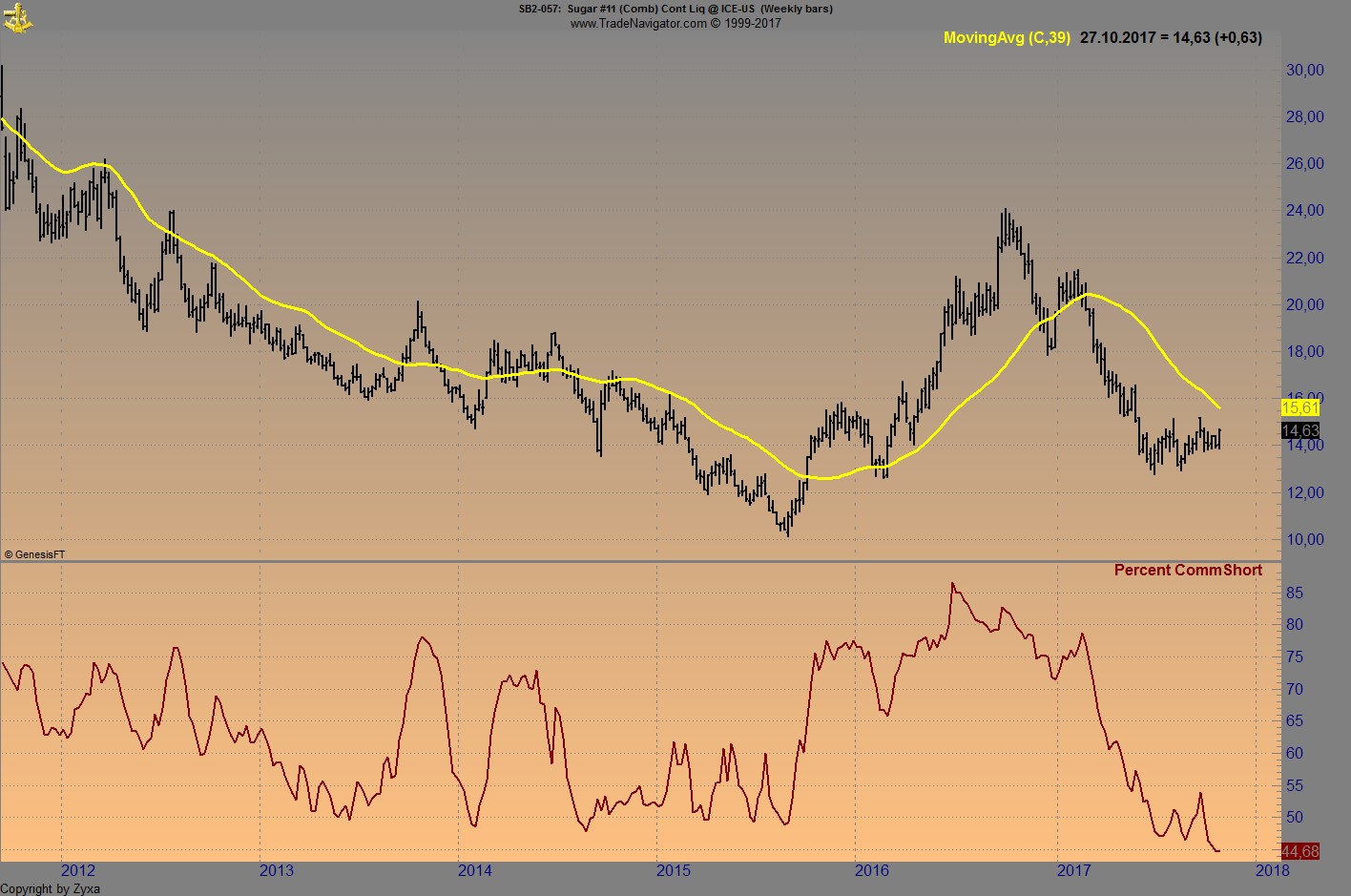 Beim Zucker sind die Comms weiter auf „long“ – atypisch.