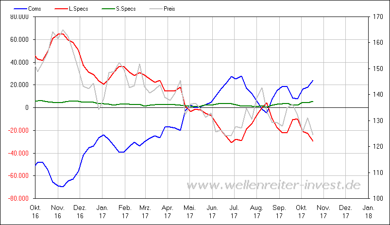 Das ist schwierig – wir haben ein ausgeliches Verhältnis zwischen Long- und Short-Abbau der Comms. Etwas mehr Long-Abbau, als Short-Abbau, deshalb Südkurs der Kurve, was schön mit sinkenden Preisen einhergeht...