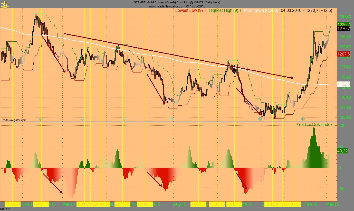 Mein Spread Indikator, der den Wert des Goldes relativ zum Dollar betrachtet, zeigt sehr schoen....naja, ihr seht ja selber.........