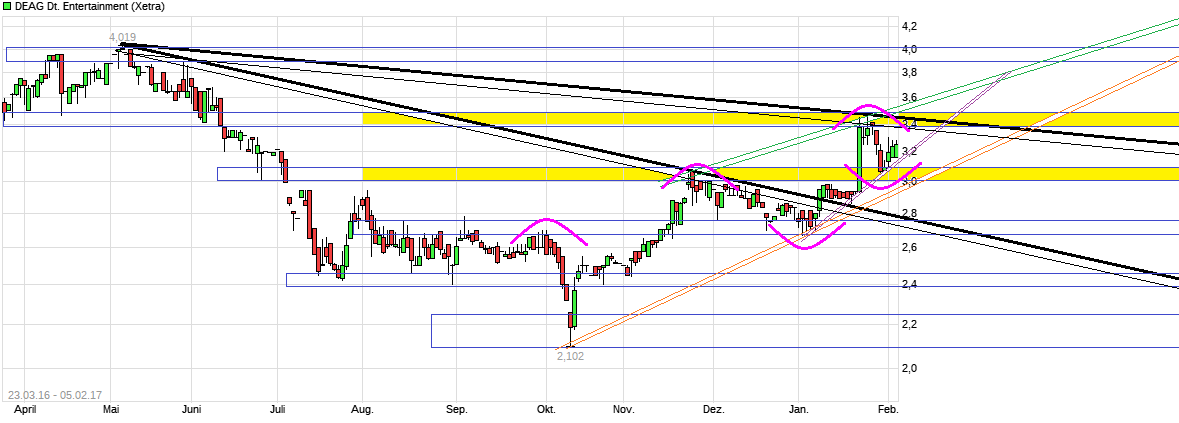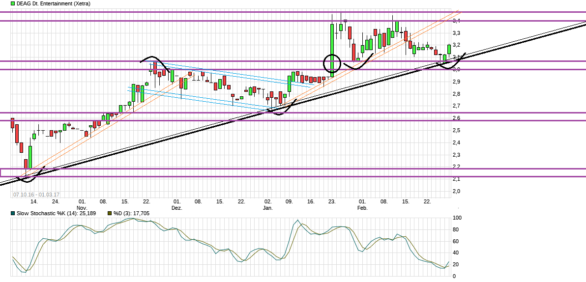 .. und es bleibt jetzt nurnoch das Festival in Wien für DEAG übrig. Hatte zwar der Buschfunk schon länger vermutet, aber nun ist es fix. Und ich bin darüber alles andere als unglücklich. Denn genau dieser aufgeblasene dämliche OpenAir Festival-Käse war schließlich der Grund warum der Kurs von 8€ auf 2€ so in den Keller ging. Je weniger von dem riskanten Kram künftig noch stattfindet, desto höher ist die Chance es kommt in der ersten Jahreshälfte zu keinen tiefen "Einschläge" dadurch und es kann sich damit (hoffentlich) endlich mehr das margenträchtige Potenzial von Myticket im Kurs entfalten. Wenn die das Festival in Wien im nächsten Jahr auch einstampfen würden, dann wäre ich gänzlich zufrieden mit der neuen Festival-Strategie :) Den ganzen überflüssigen Spuk braucht doch keiner bei DEAG, da es in Relation zu allen Veranstaltungen die DEAG über das Gesamtjahr betreut nur ein winziger Bruchteil aller verkauften Tickets darstellt, dafür aber völlig überproportionale Risiken in sich birgt. Der DEAG Kurs hat nach seinem heftigen Sprung Mitte Januar jetzt in der letzten Zeit nochmal einen Pullback an das alte Nov.16 Top gemacht, was ja zuvor ein horizontaler Widerstand war den man knackte. Jetzt ist man an der Stelle erstmal wieder nach oben abgeprallt. Wäre schön es bliebe auch weiterhin dabei, um sich im Jahresverlauf dann doch lieber wieder mehr der Region um 4€ zu widmen ;)