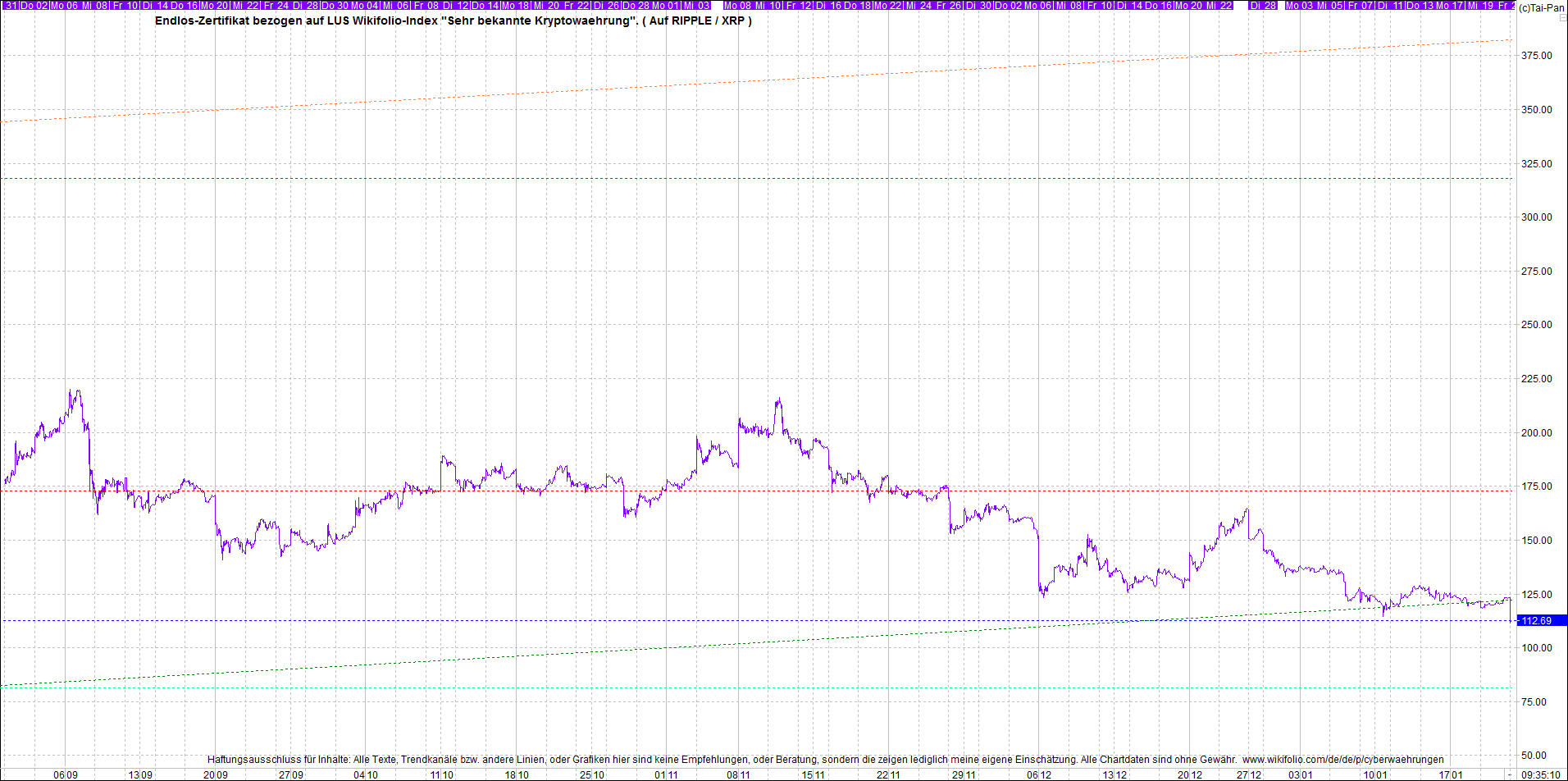 Das dazu passende Ripplezertifikat, ist bekannt als: Endlos-Zertifikat bezogen auf LUS Wikifolio-Index "Sehr bekannte Kryptowaehrung".