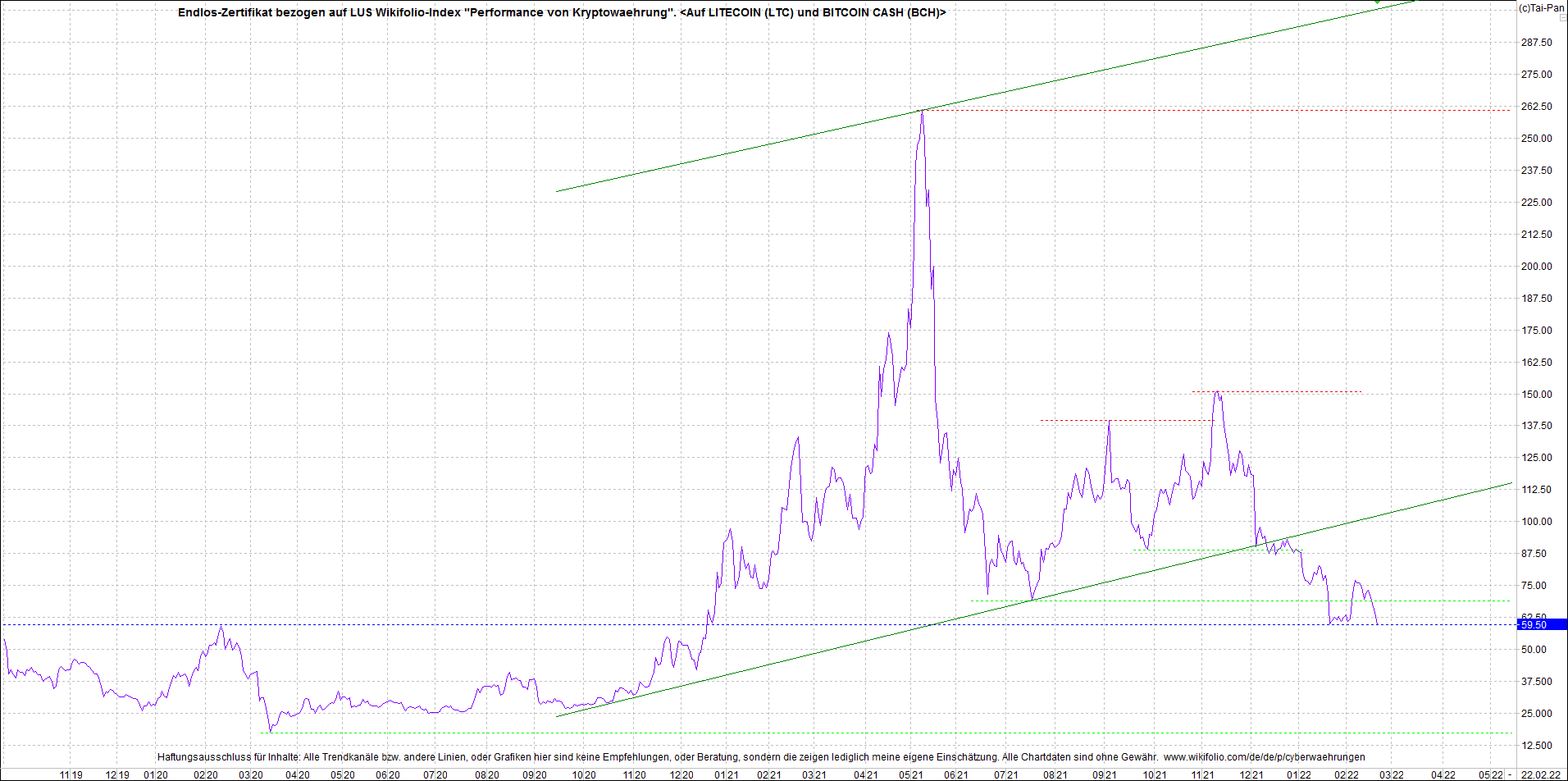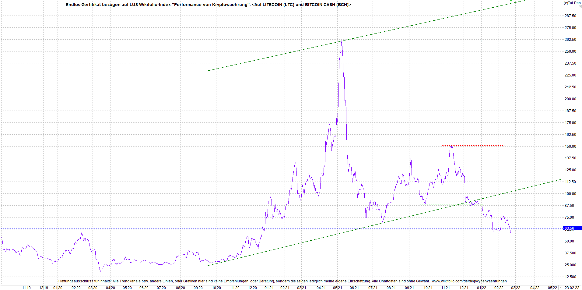 Anbei das Zertifikat, bekannt als: Endlos-Zertifikat bezogen auf LUS Wikifolio-Index "Performance von Kryptowaehrung", jetzt versorgt mit Performance von Litecoin (LTC) und von Bitcoin Cash (BCH).
