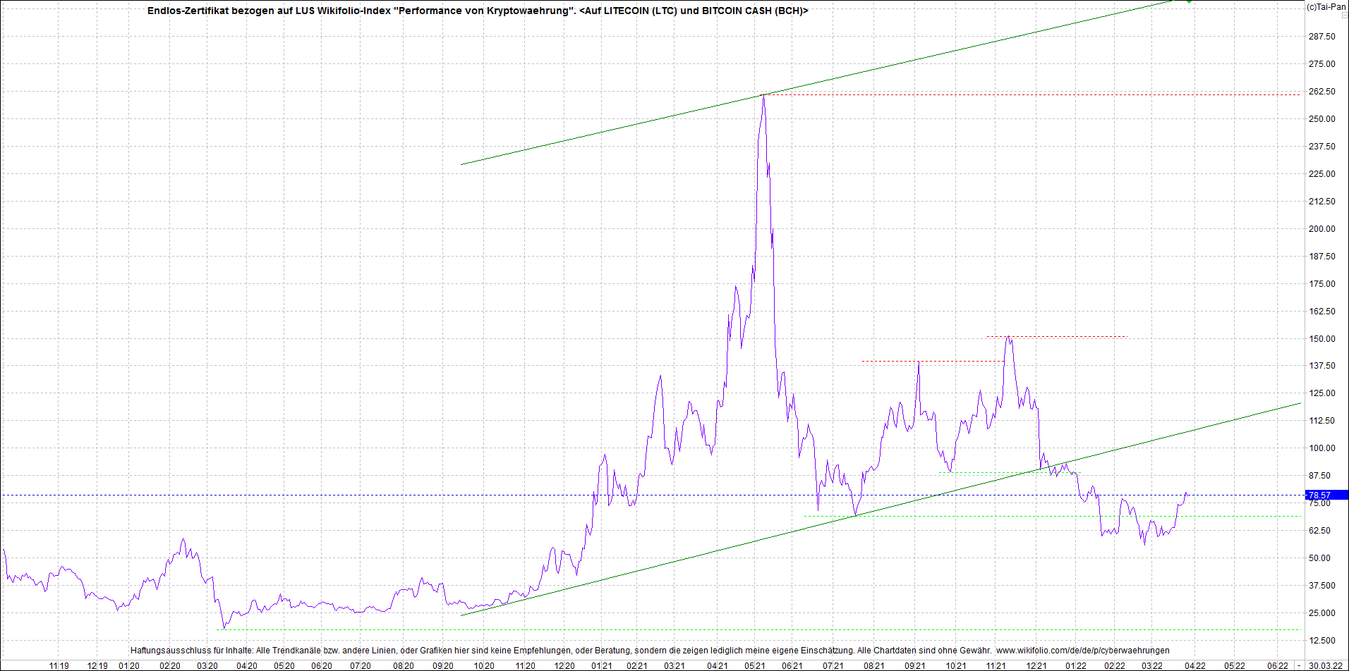 Anbei das Zertifikat, bekannt als: Endlos-Zertifikat bezogen auf LUS Wikifolio-Index "Performance von Kryptowaehrung",  jetzt versorgt mit Performance von Litecoin (LTC) und von Bitcoin Cash (BCH).