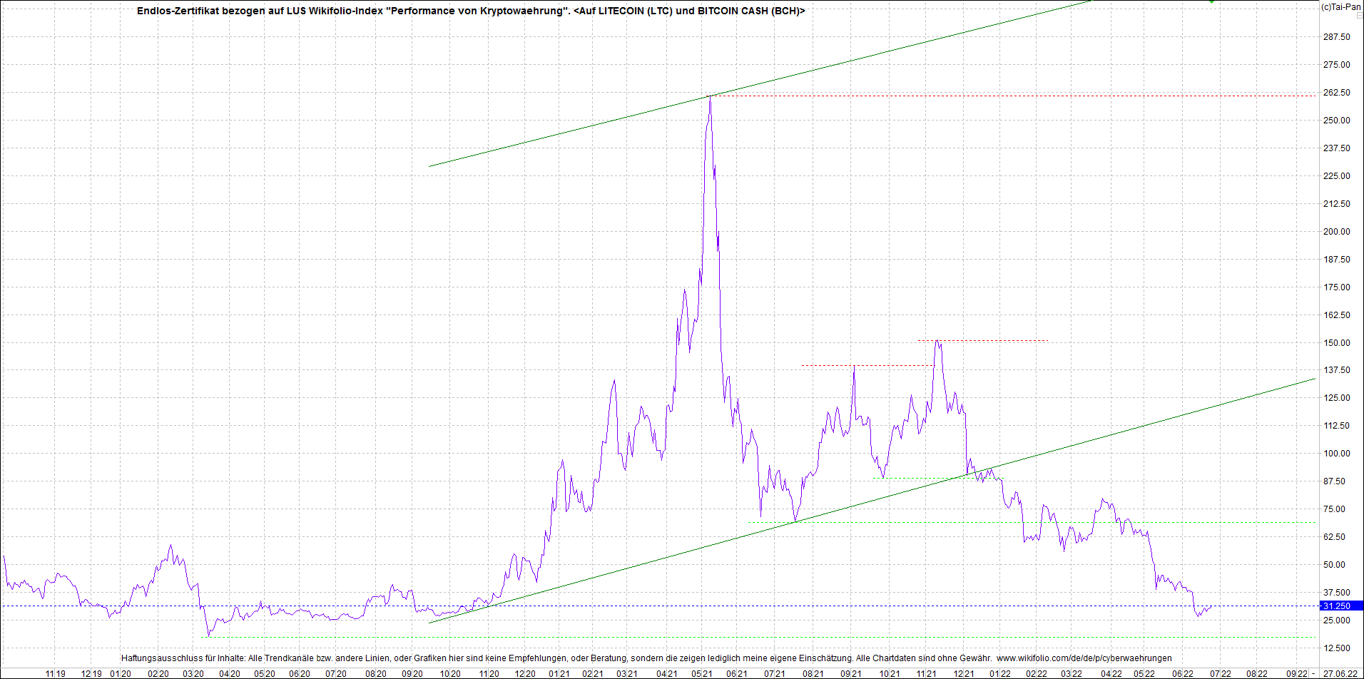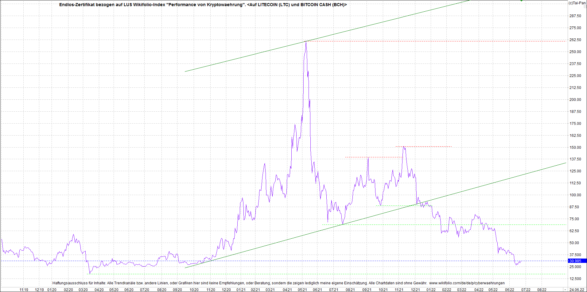 Anbei das Zertifikat, bekannt als: Endlos-Zertifikat bezogen auf LUS Wikifolio-Index "Performance von Kryptowaehrung",  jetzt versorgt mit Performance von Litecoin (LTC) und von Bitcoin Cash (BCH).