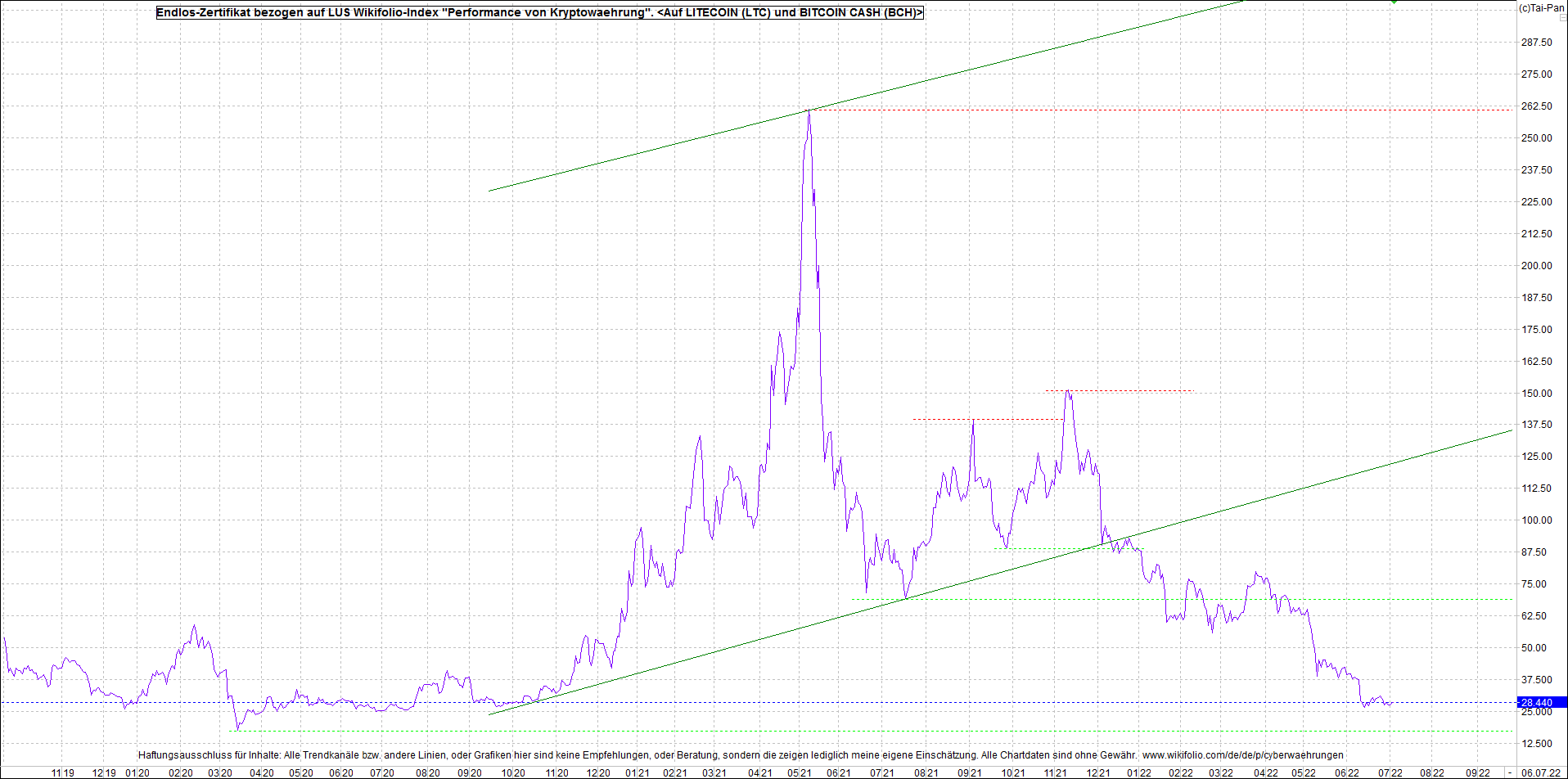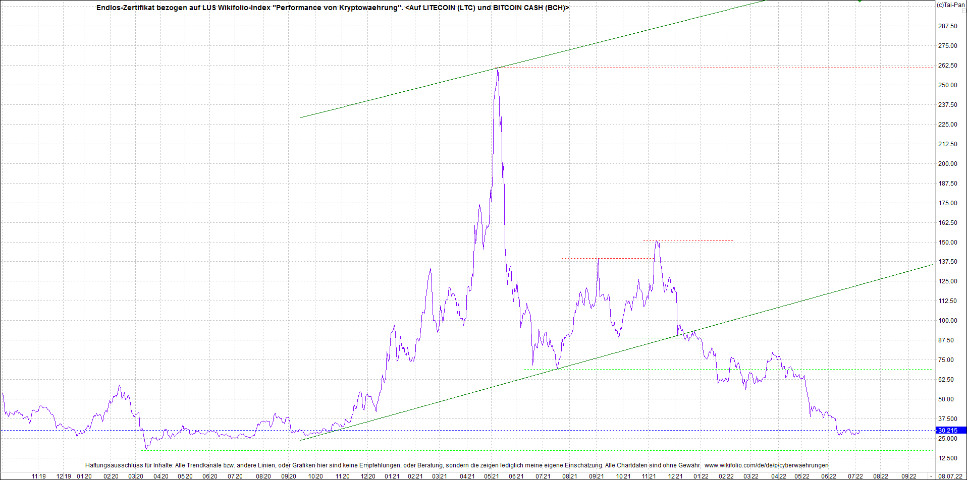 Anbei das Zertifikat, bekannt als: Endlos-Zertifikat bezogen auf LUS Wikifolio-Index "Performance von Kryptowaehrung",  jetzt versorgt mit Performance von Litecoin (LTC) und von Bitcoin Cash (BCH).