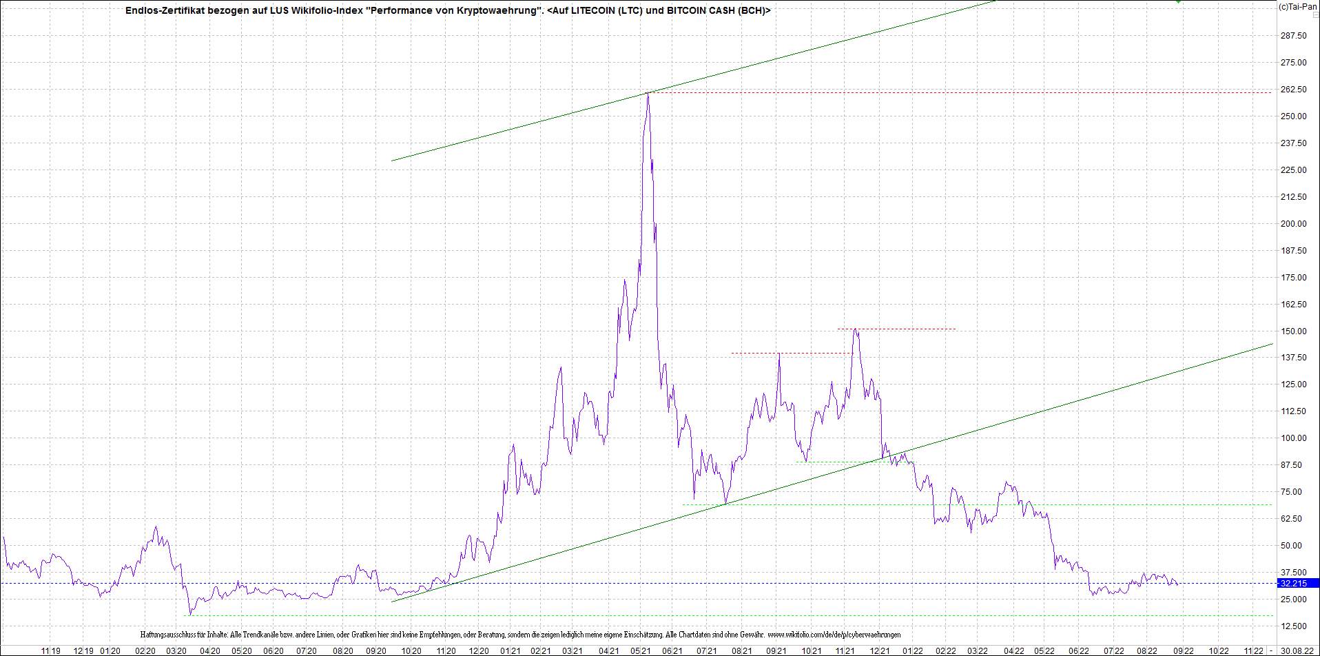 Anbei das Zertifikat, bekannt als: Endlos-Zertifikat bezogen auf LUS Wikifolio-Index "Performance von Kryptowaehrung",  jetzt versorgt mit Performance von Litecoin (LTC) und von Bitcoin Cash (BCH).