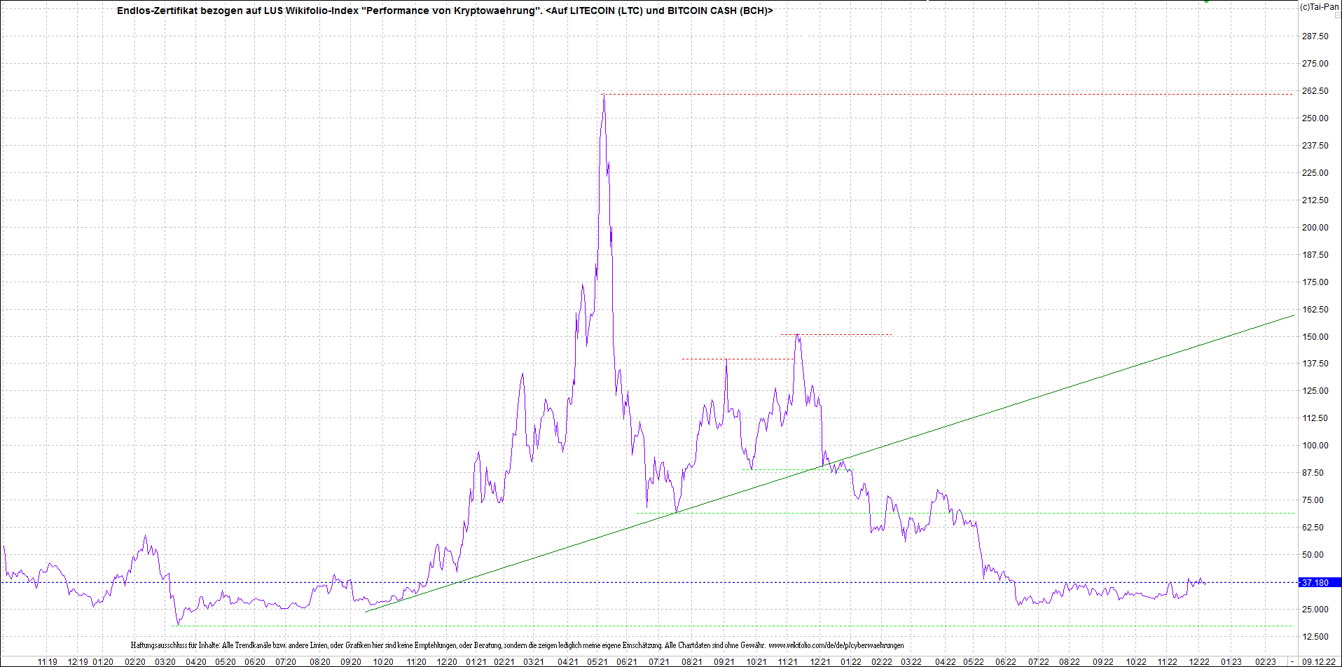 Anbei das Zertifikat, bekannt als: Endlos-Zertifikat bezogen auf LUS Wikifolio-Index "Performance von Kryptowaehrung",  jetzt versorgt mit Performance von Litecoin (LTC) und von Bitcoin Cash (BCH).