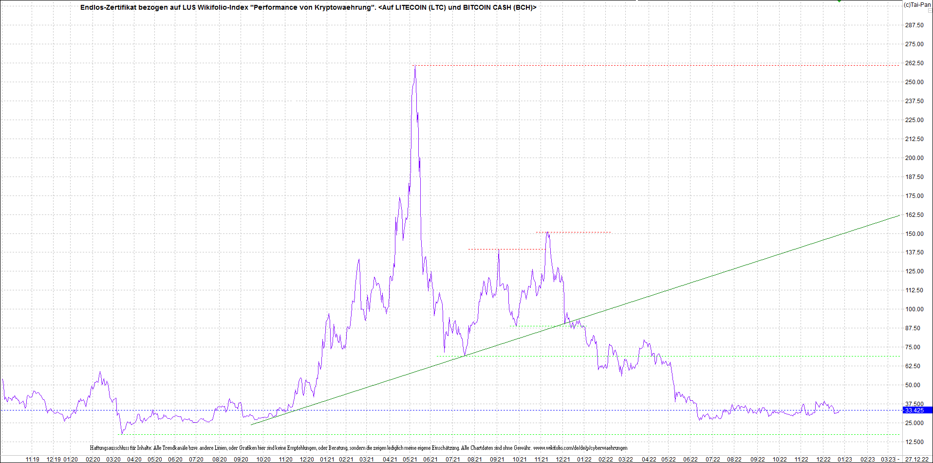 Anbei das Zertifikat, bekannt als: Endlos-Zertifikat bezogen auf LUS Wikifolio-Index "Performance von Kryptowaehrung", jetzt versorgt mit Performance von Litecoin (LTC) und von Bitcoin Cash (BCH).