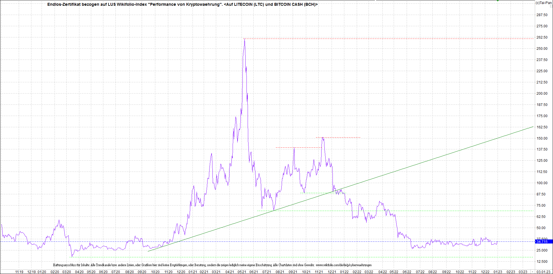 Anbei das Zertifikat, bekannt als: Endlos-Zertifikat bezogen auf LUS Wikifolio-Index "Performance von Kryptowaehrung",  jetzt versorgt mit Performance von Litecoin (LTC) und von Bitcoin Cash (BCH).